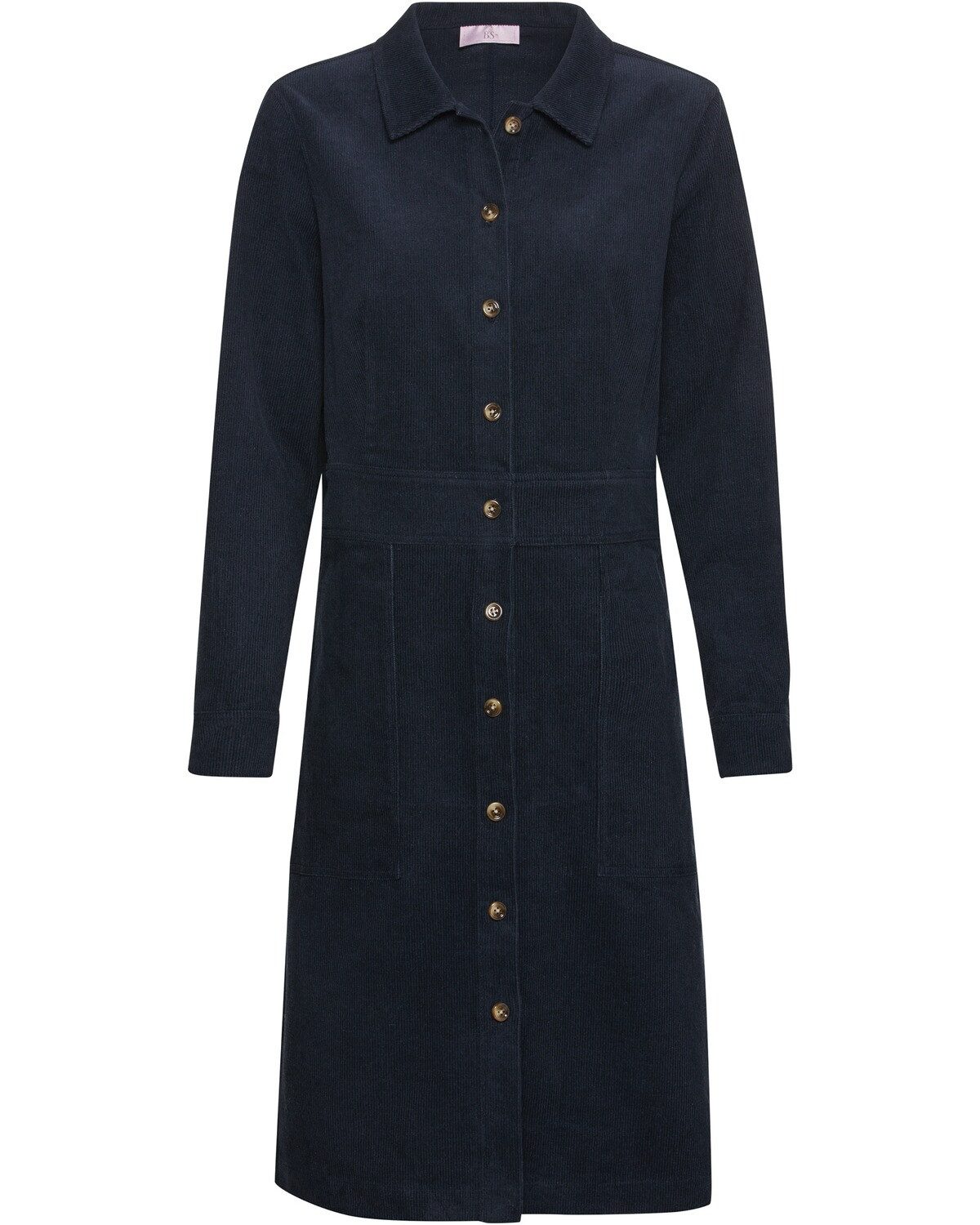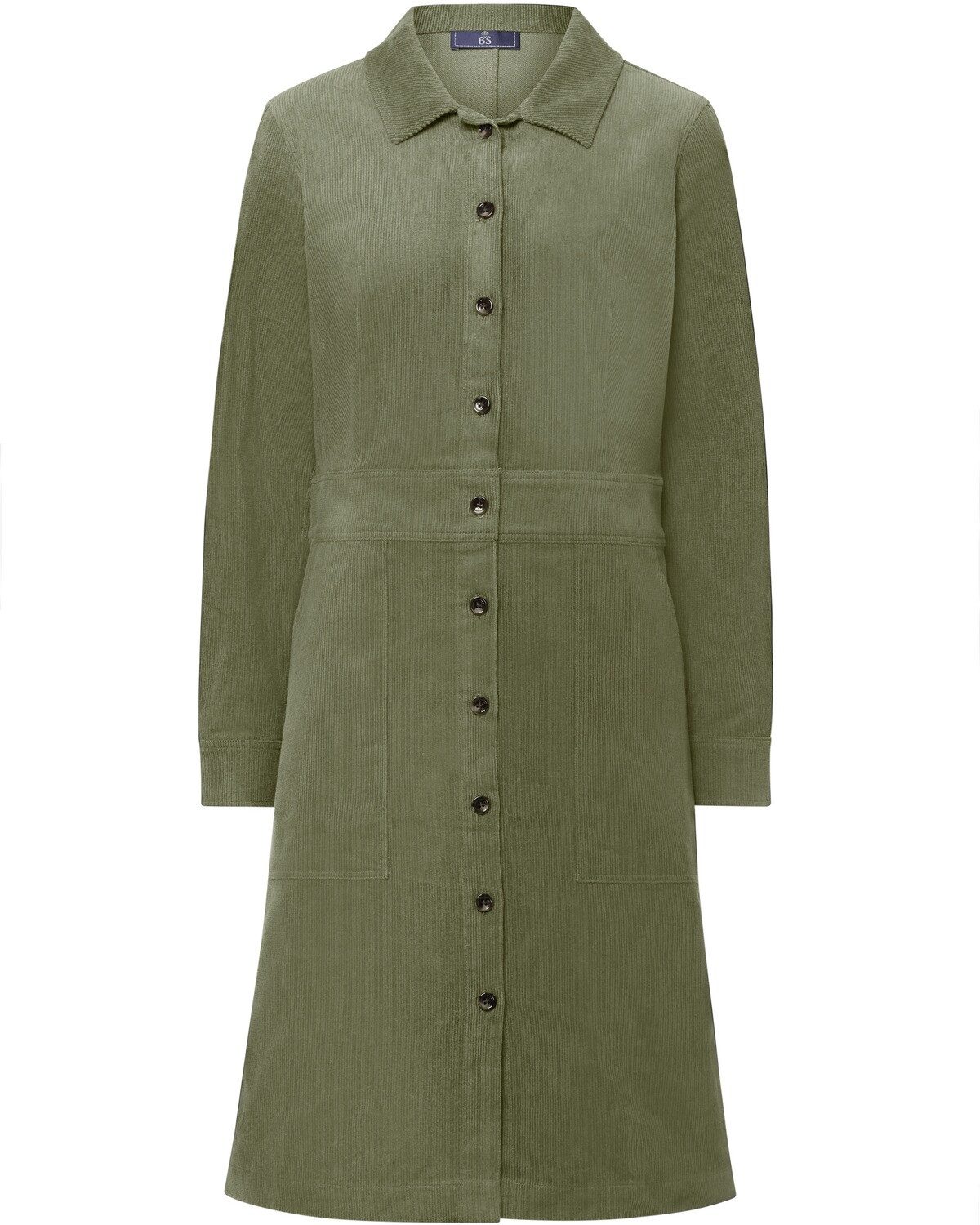 Mit diesem Cordkleid von Brigitte von Schönfels im sportiven Hemdblusenstil setzt man auf einen zeitlosen Klassiker mit modischen Akzenten. Mit seiner vorne durchgehenden Knopfleiste und den langen Ärmeln mit geknöpften Manschetten kombiniert es Komfort mit formellem Chic. Das macht es zu einem vielseitigen Begleiter für verschiedene Anlässe, von casual bis semi-formal.