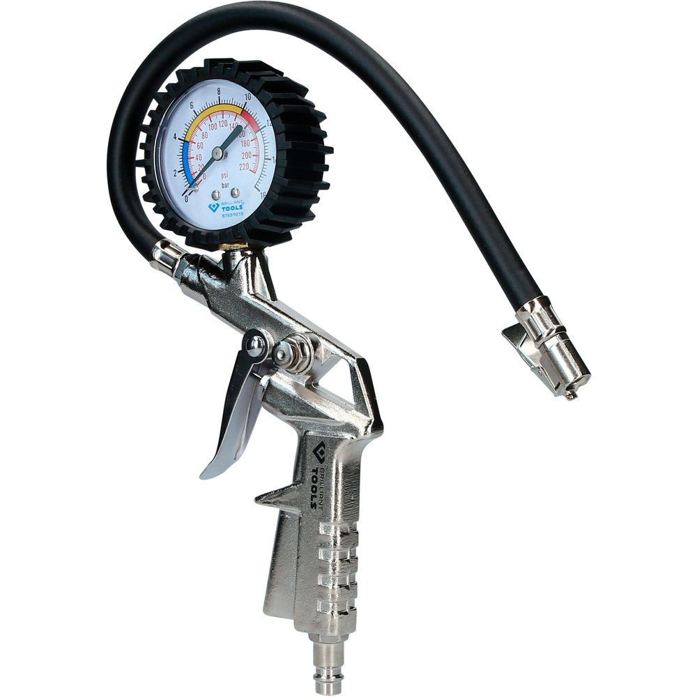 Der BRILLIANT TOOLS Reifenfüllmesser BT691019 hat einen Messbereich von 0-16 bar. Durch das seitliche Ablassventil ist er nicht nur zum Befüllen sondern auch zu Ablassen geeignet. Damit kann man mühelos den entsprechenden Druck einstellen. Das Manometer ist mit einer bar und psi Skala ausgestattet und durch eine Gummiummantelung bestens vor Beschädigungen geschützt. Durch den, im Lieferumfang enthaltenen, 1/4" Anschlussnippel ist der Reifenfüllmesser direkt einsatzbereit