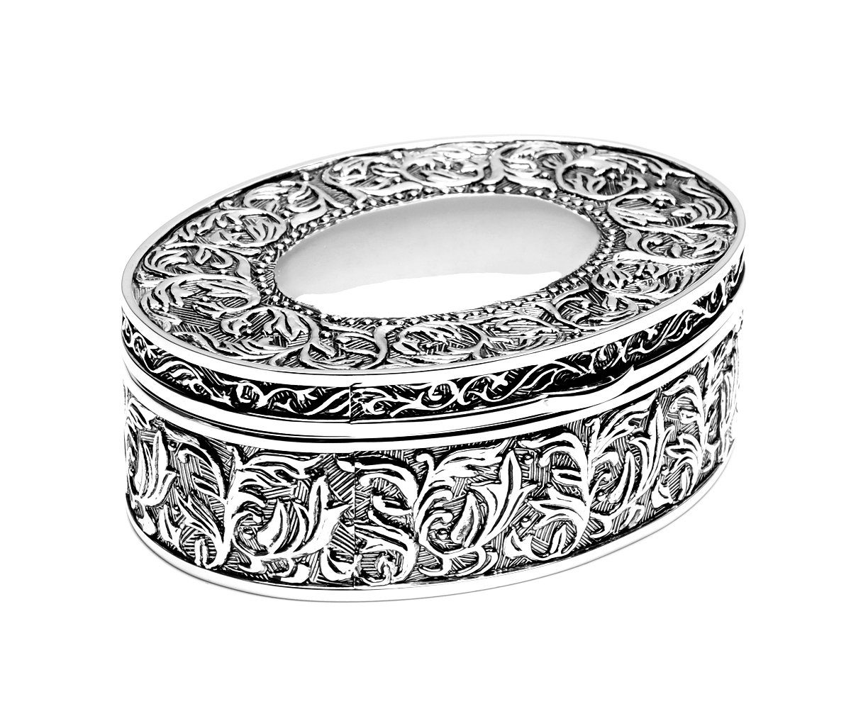 Hochwertigste Verarbeitung auf der ganzen Linie, die Sie begeistern wird. Außen ist die ovale Schmuckschatulle versilbert edel verziert, im Inneren luxuriös anmutend, da die Schmuckbox mit Stoff ausgekleidet wurde: Ein Traum von einem Schmucketui in silber.
