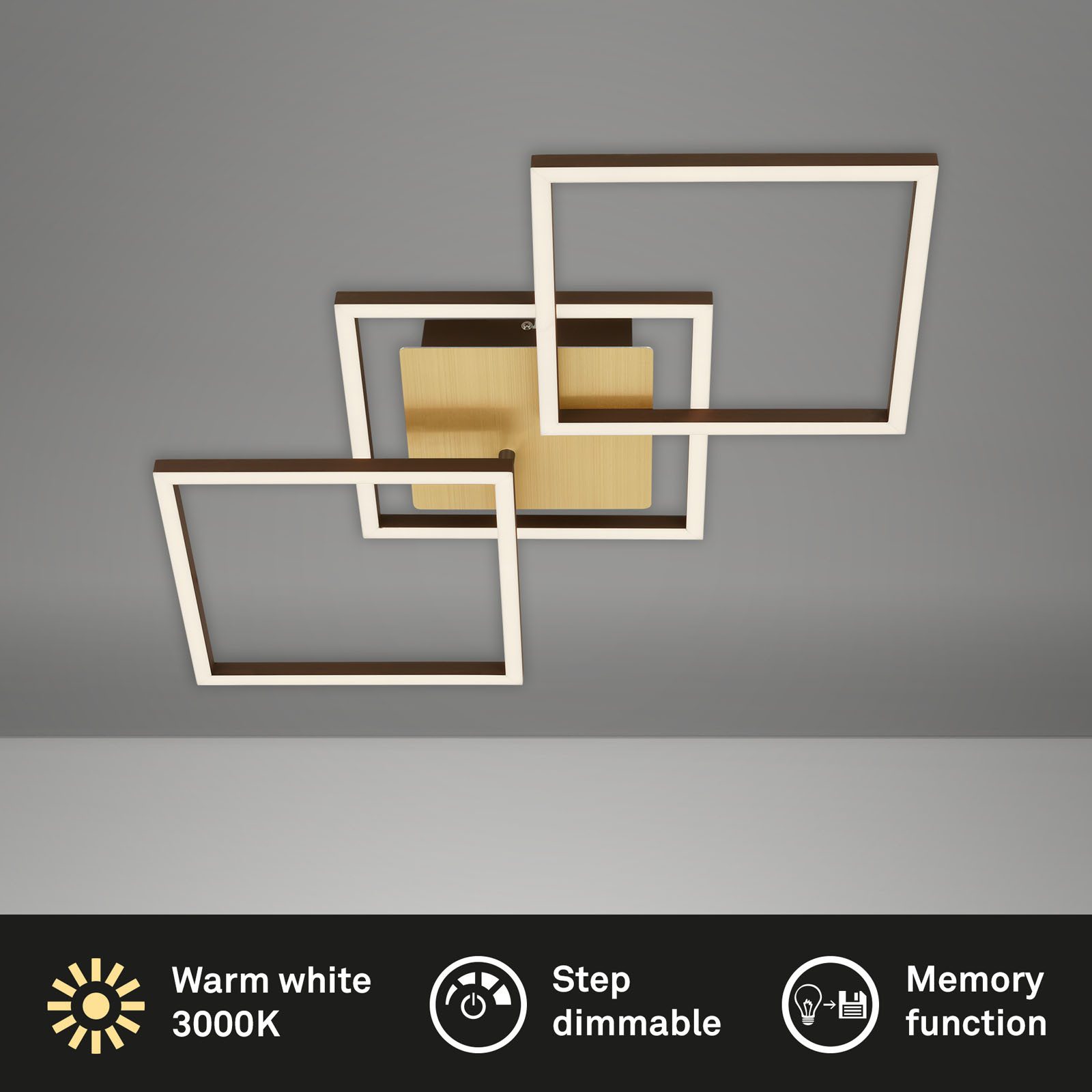 Diese moderne LED Deckenlampe verfügt über vier quadratische LED-Module in Schwarz, gefertigt aus hochwertigem Metall-Kunststoff. Die edle Optik wird durch eine Holzauflage auf dem Baldachin zusätzlich aufgewertet.
