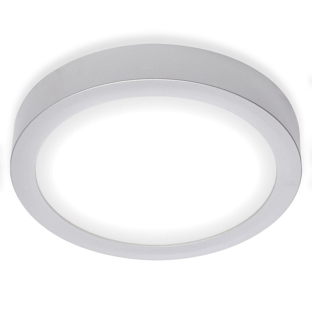 Moderne, runde LED Aufbauleuchte in chrom-matt, gefertigt aus Metall-Kunststoff. Diese Deckenlampe besticht durch ihr schlichtes Design und ist vielseitig einsetzbar, z.B. als Wohnzimmerleuchte, Schlafzimmerleuchte oder Küchenleuchte.