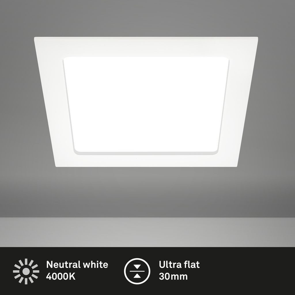 Die ultraflache weiße LED-Einbauleuchte FLAT-IN ist mit einer 12-Watt-LED-Platine ausgestattet und bietet einen Lichtstrom von 1200 Lumen. Dank einer Farbtemperatur von 4000 Kelvin strahlt die Leuchte ein angenehm neutralweißes Licht aus. Die Leuchte misst 170 x 170 x 30 mm (T x H) und ihre Einbaumaße betragen 160 x 160 x 30 mm (T x H). Die Einbauleuchten lassen sich dank eines integrierten Transformators problemlos an Ihre 230-Volt-Steckdose anschließen. Für die Einbauleuchten ist kein Transformator erforderlich. Der direkte Anschluss an das 230-V-Stromnetz ist möglich.