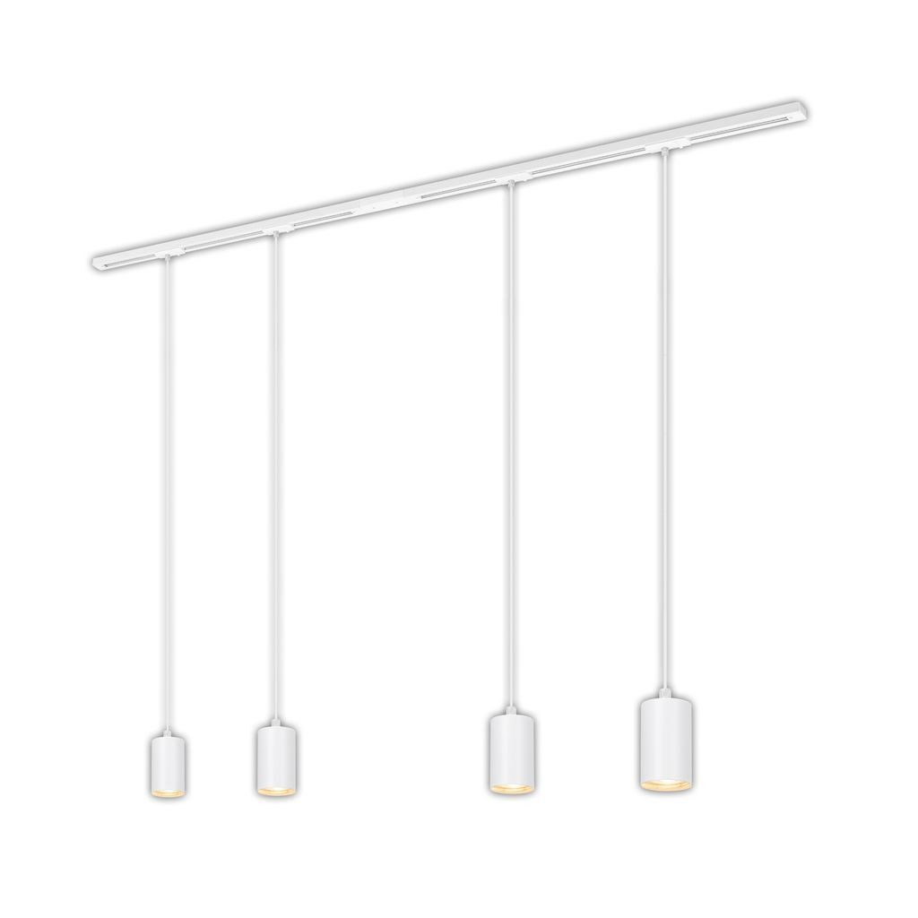 Dieses Set umfasst eine weiße Einspeisung (8002006), zwei weiße Schienen à 0,75 Meter (8003006) und vier GU10-Pendelleuchten in Weiß (8006016).