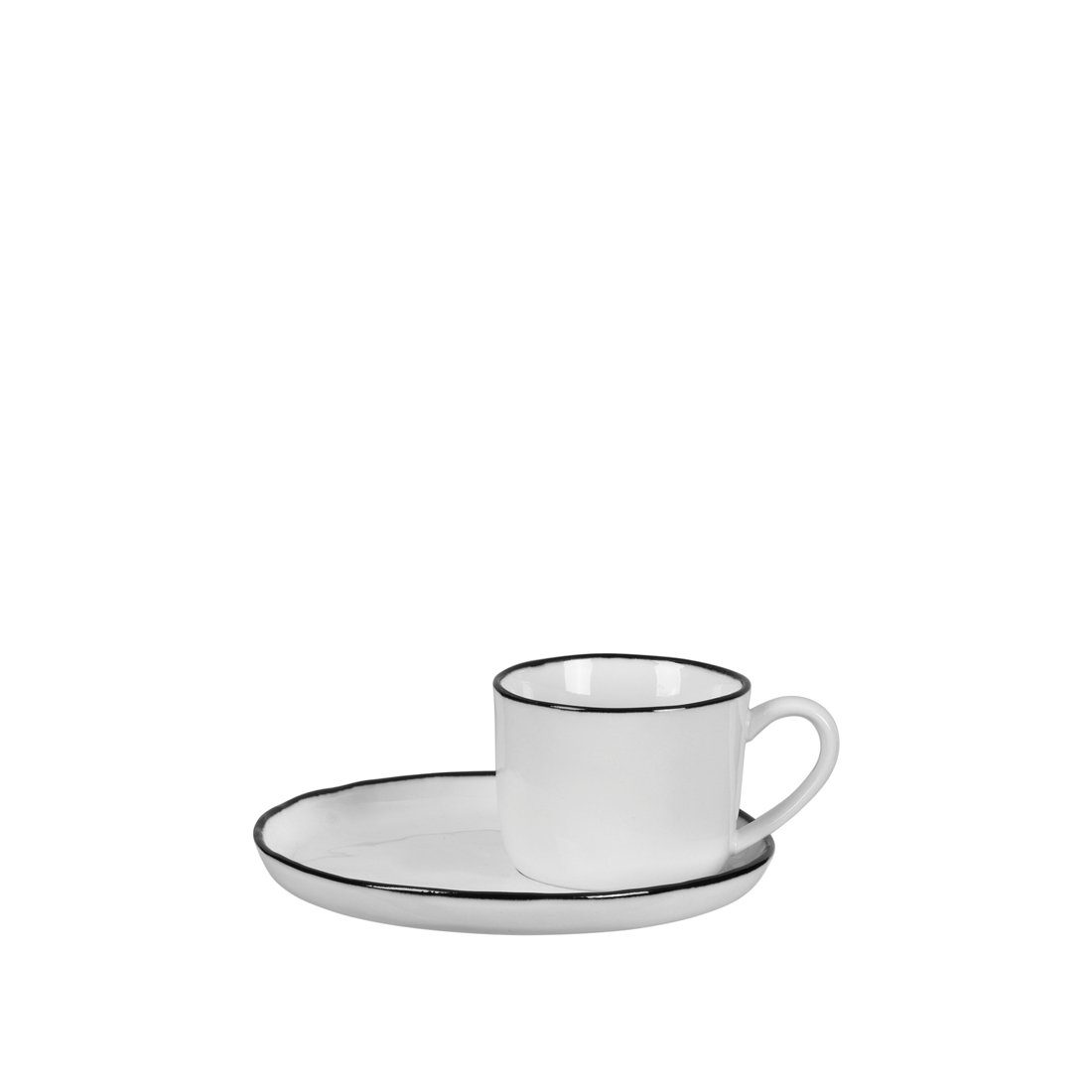 Handgefertigte Espressotasse mit Untertasse aus der Designserie "Nordic Salt" von Broste Copenhagen. Die Tasse ist aus hochwertigem Porzellan hergestellt und fasst 100 ml. Die Farbgebung und Form ist so gewählt, dass eine gewollte Ungleichmäßigkeit erreicht wird. In Kombination mit den anderen Artikeln aus der Serie Salt holen Sie sich Skandinavien pur auf Ihren gedeckten Tisch. Sie können alle Artikel aus der Geschirrserie Salt in der Spülmaschine reinigen und in der Mikrowelle verwenden. Design: Serie "Salt" Durchmesser: 6,4 cm Höhe: 5 cm Fassungsvermögen: 100 ml Durchmesser Unterteller: 13 cm Farbe: weiß mit schwarzem Rand - handlasiert Material: Porzellan Maximale Spülmaschinentemperatur: 65 C° Mikrowellen: bis 675W