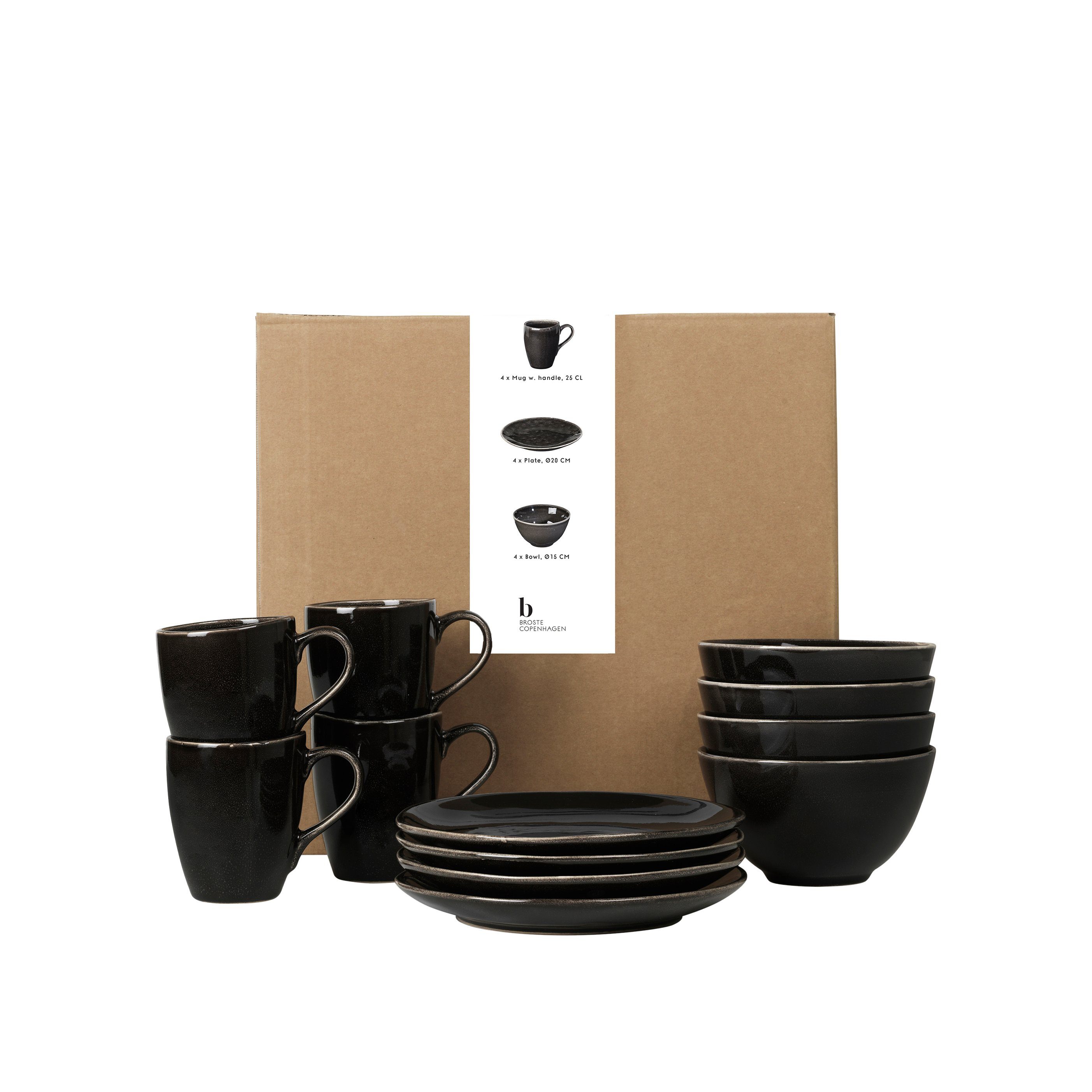 Broste Copenhagen - Nordic Coal Geschirr Frühstücksset Beginnen Sie Ihren Tag mit dem Nordic Coal Frühstücksset von Broste Copenhagen. Dieses schöne Set aus Steingut mit einer dunklen, glänzenden Glasur ist perfekt für einen schnellen Snack oder eine herzhafte Mahlzeit. Die organischen Formen und der starke Ausdruck des Sets bringen Persönlichkeit auf Ihren Küchentisch. Das Set besteht aus vier Frühstückstellern, vier Schüsseln und vier Tassen. Es ist mikrowellen- und spülmaschinengeeignet, damit Sie es bequem benutzen können. Broste Copenhagen lässt sich von den Rohstoffen der Natur inspirieren, um einen einzigartigen Look für Ihr Zuhause zu schaffen. Ergänzen Sie Ihre Küche noch heute mit dem Nordic Coal Frühstücksset und verleihen Sie ihr einen Hauch von skandinavischem Stil.