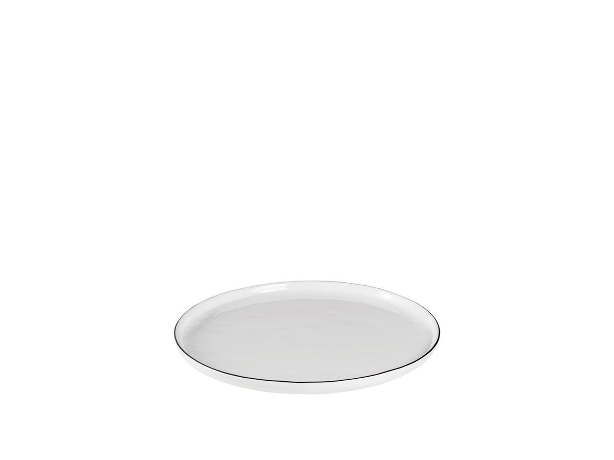 Handgefertigter Speiseteller mit 28 cm Durchmesser von Broste Copenhagen. Der Teller aus der Designserie "Salt" ist aus Porzellan. Die Glasur ist weiß mit schwarzem Rand und gewollt etwas uneben. Die Farbgebung und Form ist so gewählt, dass eine gewollte Ungleichmäßigkeit erreicht wird. In Kombination mit den anderen Artikeln aus der Serie Salt holen Sie sich Skandinavien pur auf Ihren gedeckten Tisch. Sie können alle Artikel aus der Geschirrserie Salt in der Spülmaschine reinigen und in der Mikrowelle verwenden. Design: Serie "Salt" Durchmesser: 28 cm Höhe: 1,5 cm Farbe: weiß mit schwarzem Rand - handlasiert Material: Porzellan Maximale Spülmaschinentemperatur: 65 C° Mikrowellen: bis 675W