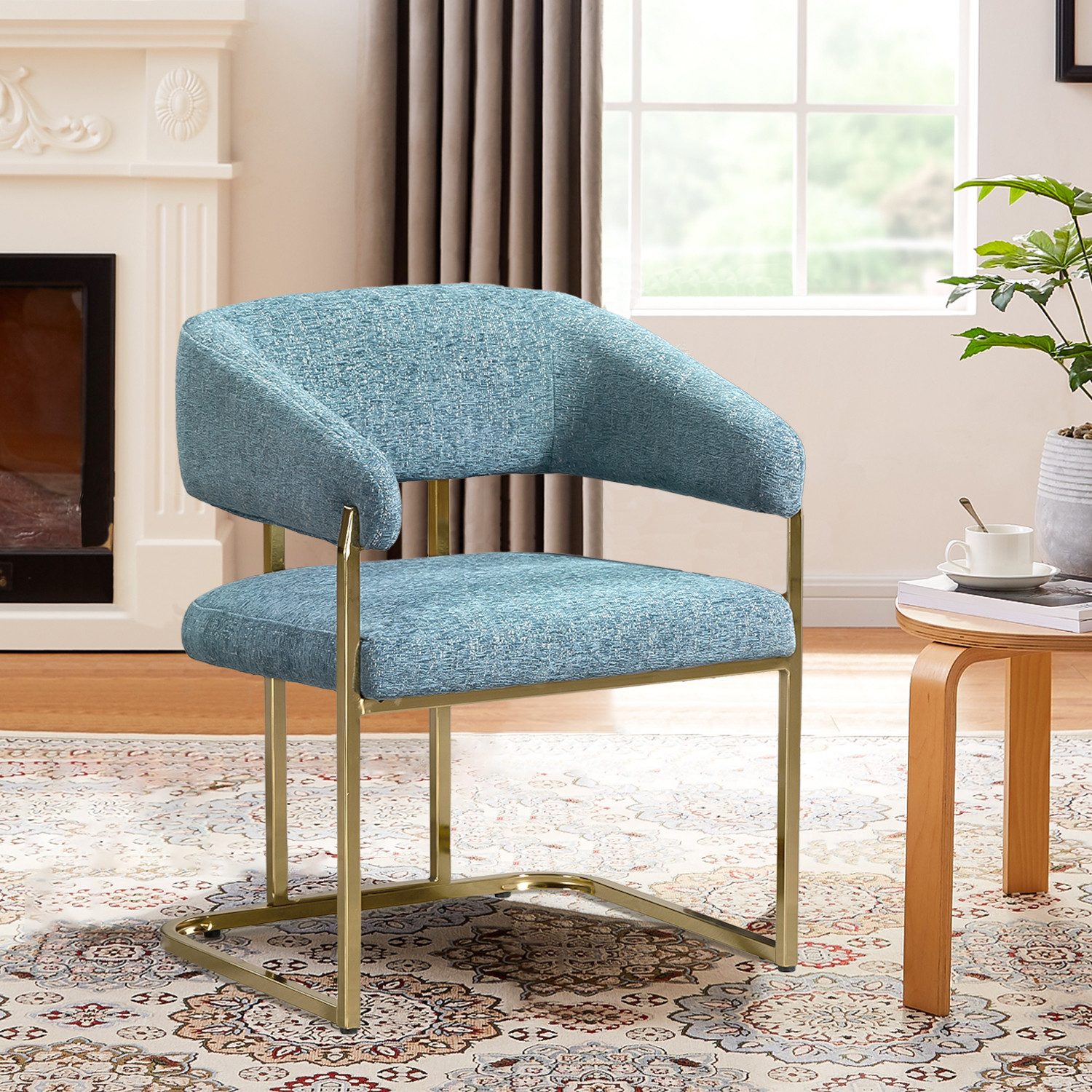 Dieser Esszimmerstuhl besteht aus einer einzigartigen Mischung von Chenille und Leinen und weist eine raffinierte und weiche Textur auf. Der Esszimmerstuhl verfügt über eine großzügige Sitzfläche von 56 cm Breite und 54 cm Tiefe. Die vergoldeten Beine sind mit einer galvanischen Beschichtung versehen, was zu einer gleichmäßigen, nahtlosen Schicht führt, die die Haltbarkeit erhöht. Darüber hinaus verstärken zwei zusätzliche metallische Stützstreben die Stabilität des Stuhls, sodass er ein maximales Gewicht von 150 kg tragen kann. Antirutschkissen an den Beinen des Stuhls schützen den Boden vor Kratzern und minimieren Geräusche.
