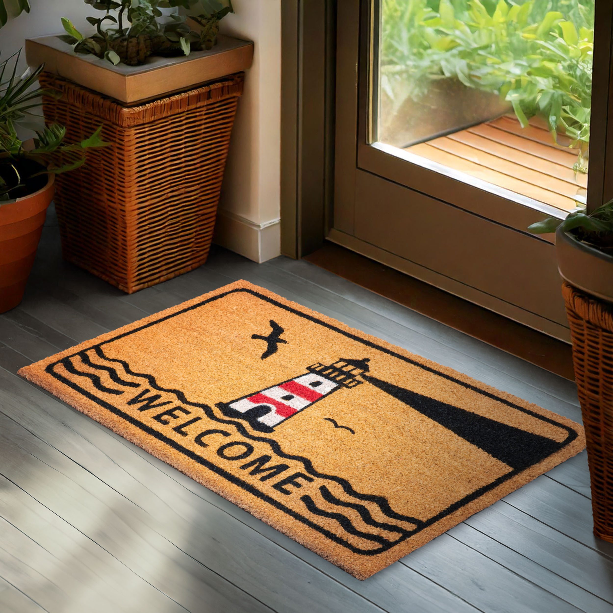 Mit der BRUBAKER Fußmatte holst du dir ein Stück Meer direkt vor die Haustür. Ob Leuchtturm, Steuerrad, Anker, „Welcome on Board“ oder blaue Fische – der maritime Look sorgt für maritimes Flair auf Terrasse, Eingang oder Treppe. Als Schuhabtreter in Standardgröße (45 x 75 cm) hält die Kokosmatte Schmutz zuverlässig draußen und sorgt dafür, dass dein Zuhause sauber bleibt.