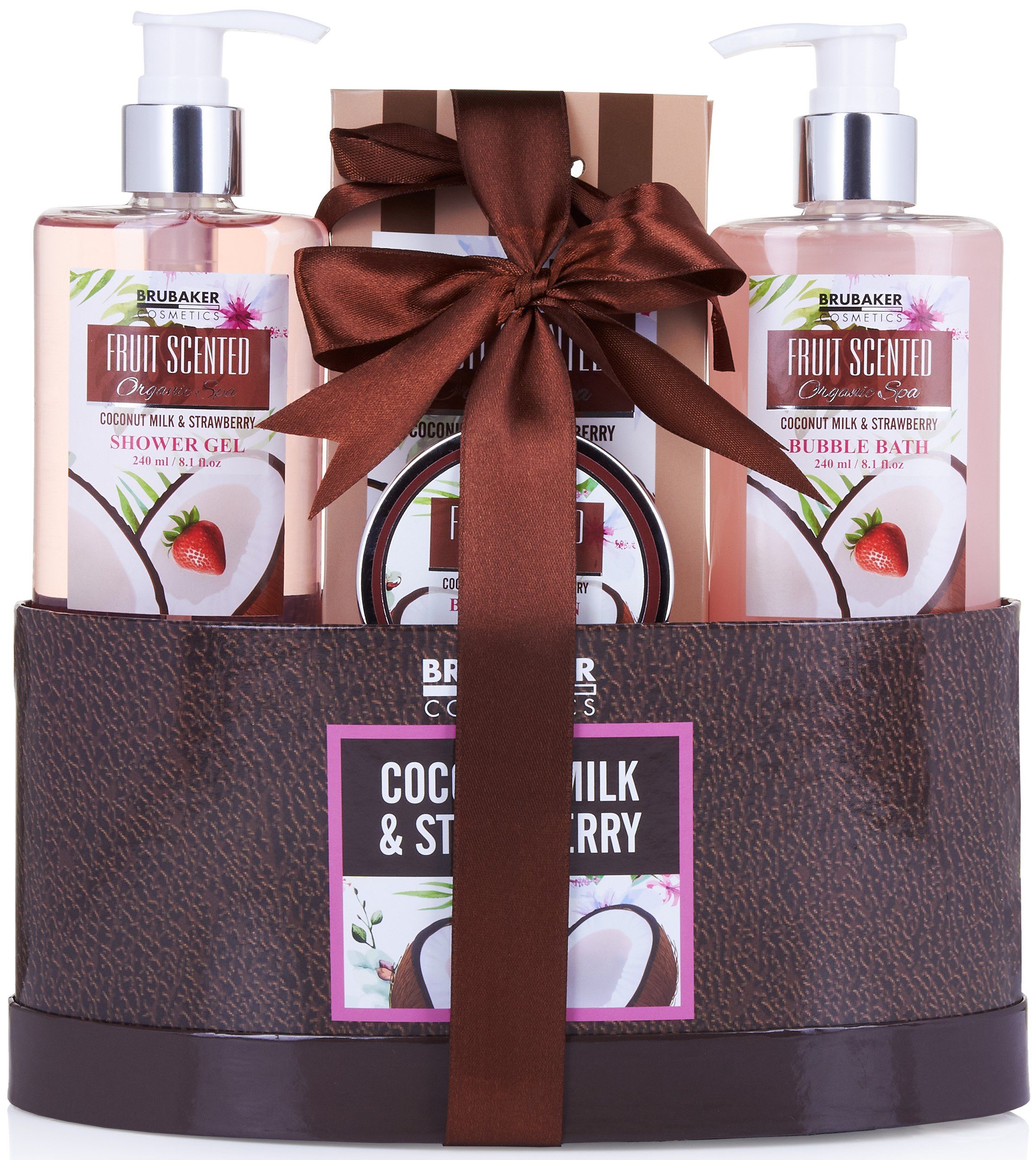 BRUBAKER Cosmetics Bade- und Dusch Set "Coconut Milk & Strawberry" - Kokosnuss und Erdbeer Duft - 5-teiliges Geschenkset in Geschenkbox