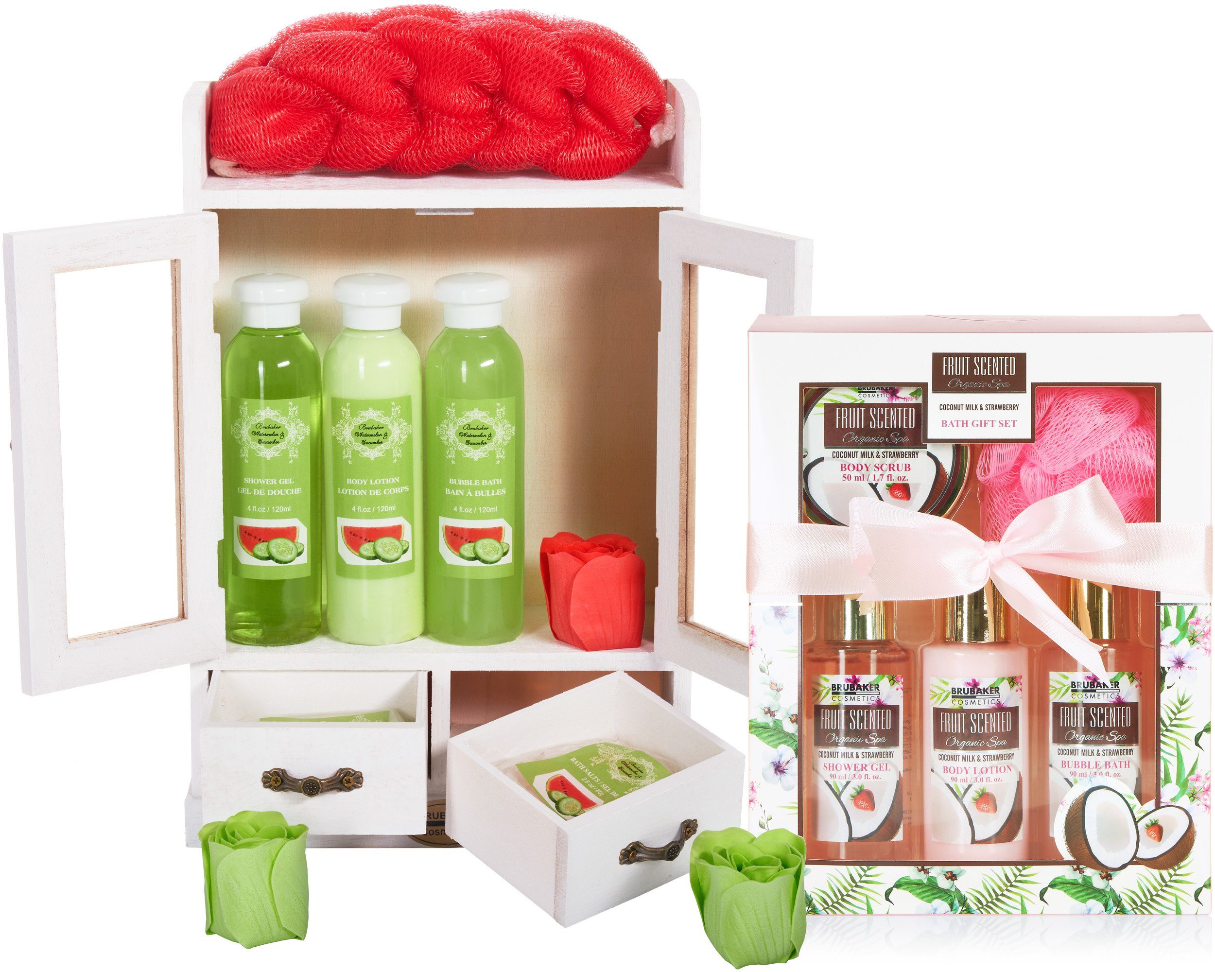Das Melonen Set enthält 3 Duftrosen, 120 ml Bodylotion, 120 ml Duschgel, 120 ml Schaumbad, 1 Peeling Schwamm, 2x 80 g Badesalz und ein Holzschränkchen (19 x 29 x 7,5 cm)