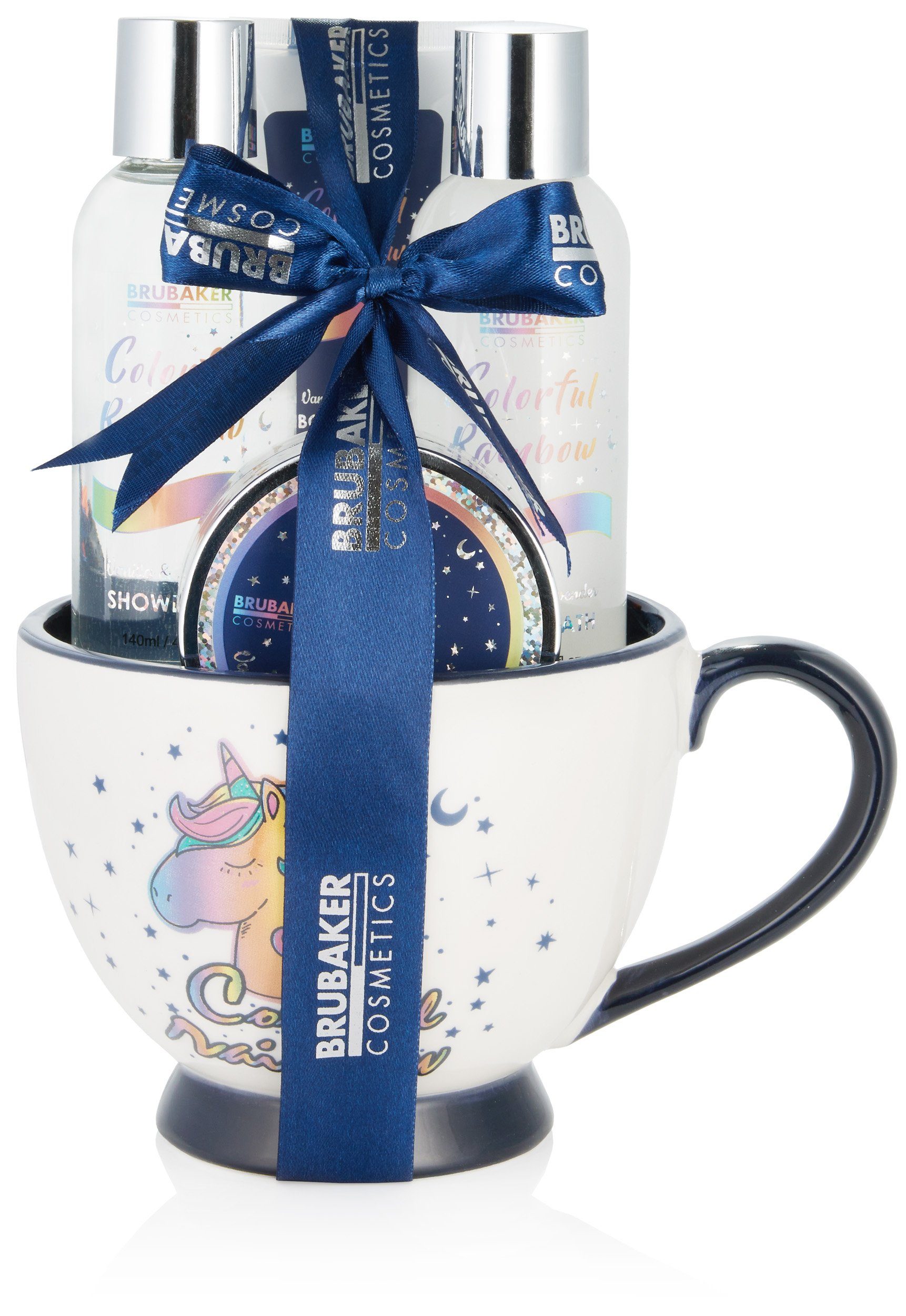 Das Einhorn Beauty Set ist ein perfektes Give Away, Mitbringsel, Wichtelgeschenk, Weihnachtsgeschenk, Geschenk zum Nikolaus, zu Ostern, zum Valentinstag oder zum Geburtstag. Die süßen Einhornmotive in Regenbogenfarben, funkelnde Silbersternchen und die Tasse in Blau-Weiß machen das Einhorn-Geschenkset zum Hingucker.