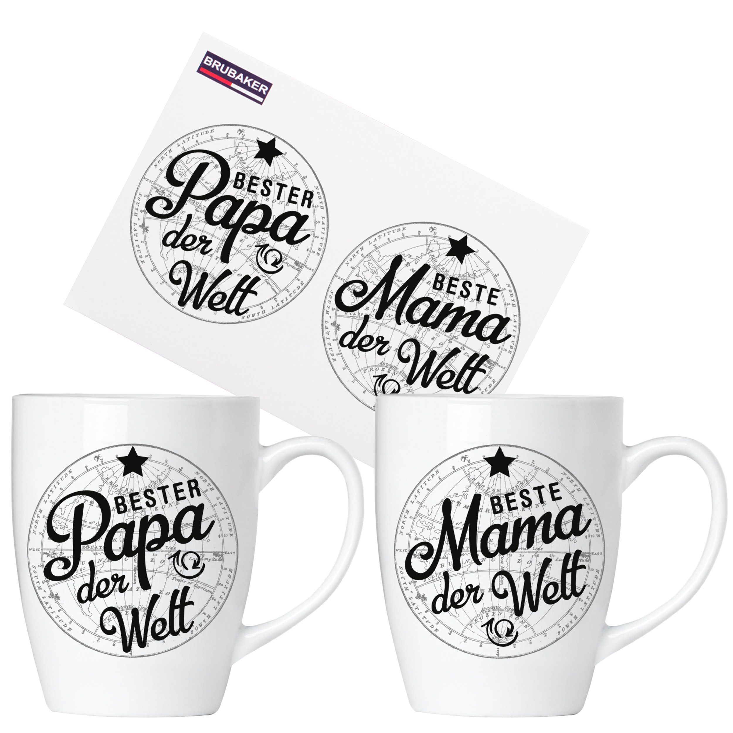 BRUBAKER "Beste Mama..." und "Bester Papa..." Tassen Geschenkset aus Keramik - Kaffeebecher 300 ml - mit Grußkarte und Geschenkpackung