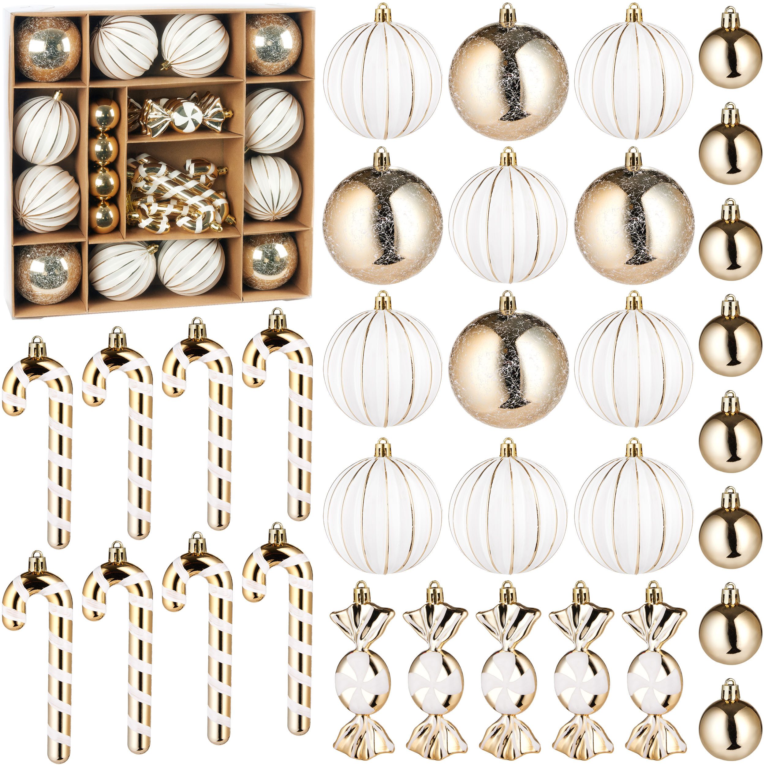 Lieferumfang | 4x Kugel glänzend, 8x Kugel matt, 8x Minikugel, 5x Bonbon Anhänger, 8x Zuckerstange Anhänger |