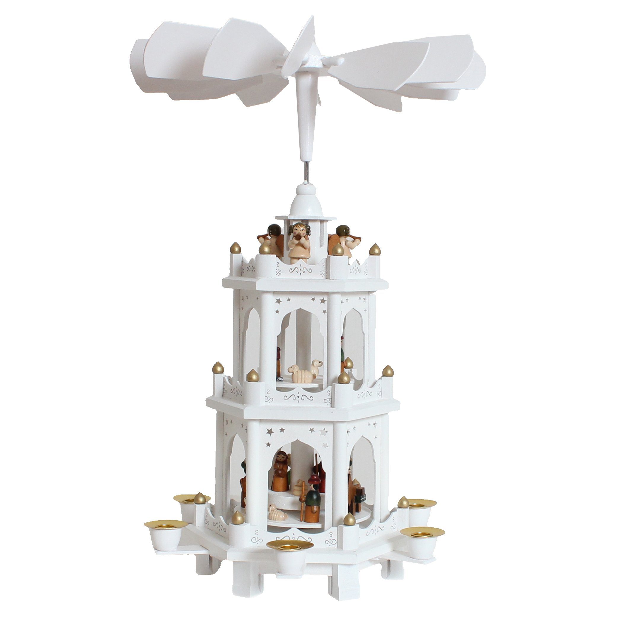 Auf den einzelnen Etagen werden verschiedene Szenen der biblischen Weihnachtsgeschichte lebendig. Auf der obersten, nicht drehbaren Ebene geben Engel mit Posaunen die Geburt des Jesuskinds kund. Auf der mittleren Etage ziehen Schafe ihre Kreise. Auf der unteren, rotierenden Ebene ist die Geburt Christi mit Maria und Josef und der Ankunft der Heiligen Drei Könige dargestellt.