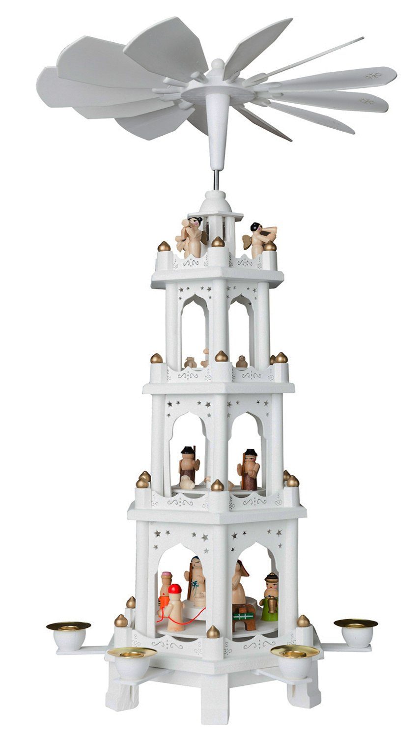 Ein kunstvoll gefertigter Zaun umschließt jede einzelne Ebene. Goldene Kugeln in Zapfenform sind auf den Zaunpfosten angebracht. Die Ebenen werden von Säulen getragen, liebevoll ausgesägte maurische Bögen erinnern an das Abendland. Jede Figur ist handbemalt. Für den Betrieb werden sechs Pyramidenkerzen benötigt. An der unteren Plattform werden die sechs Kerzenhalter befestigt.