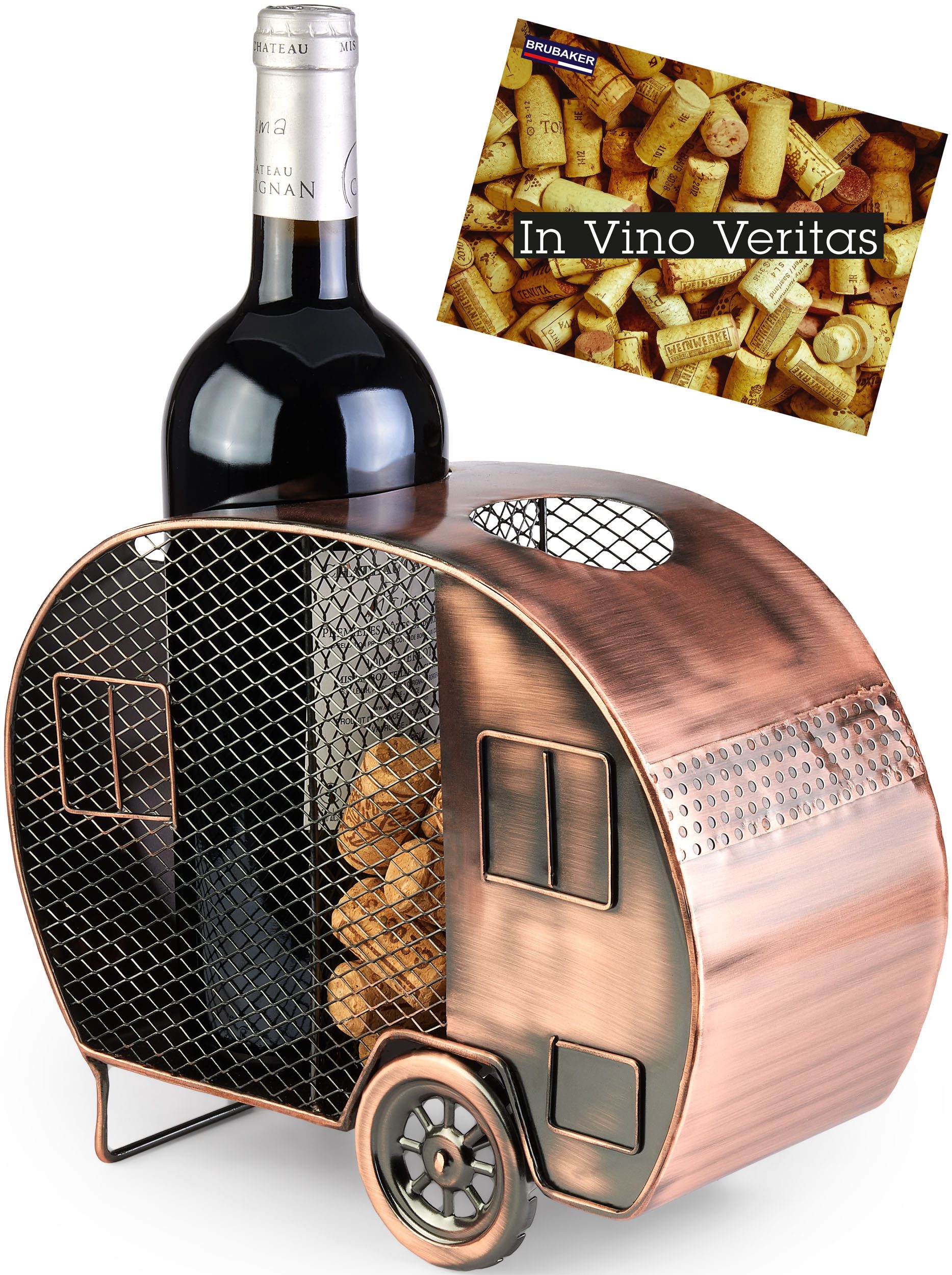 Dieser außergewöhnliche BRUBAKER Weinflaschenhalter in Form eines Wohnwagens bringt den Campingplatz direkt in dein Zuhause. Mit seiner kupferfarbenen Optik wird der Flaschenhalter zum Blickfang in deiner Küche, deinem Wohnzimmer oder auf deiner festlich gedeckten Tafel. Egal ob als originelle Dekoration oder praktischer Flaschenständer – dieser Weinhalter vereint Stil und Funktion in einem charmanten Design.