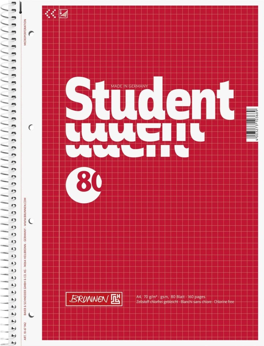 BRUNNEN Notizblock Kollegblock Student A4 70g/qm kariert 80 Blatt rot (5 Stück)