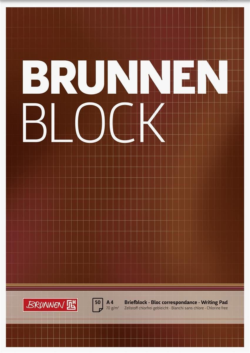 Briefpapierblock. Werkstoff: holzfrei. Flächenmasse des Papiers: 70 q/qm. Qualitätspapier. Papierformat: A4. Ausführung der Lineatur: kariert. Farbe: weiß. Anzahl der Blätter: 50 Stück., A4 · 50 Blatt · BRUNNEN-Block · rautiert · ungelocht · 70 g/m²
