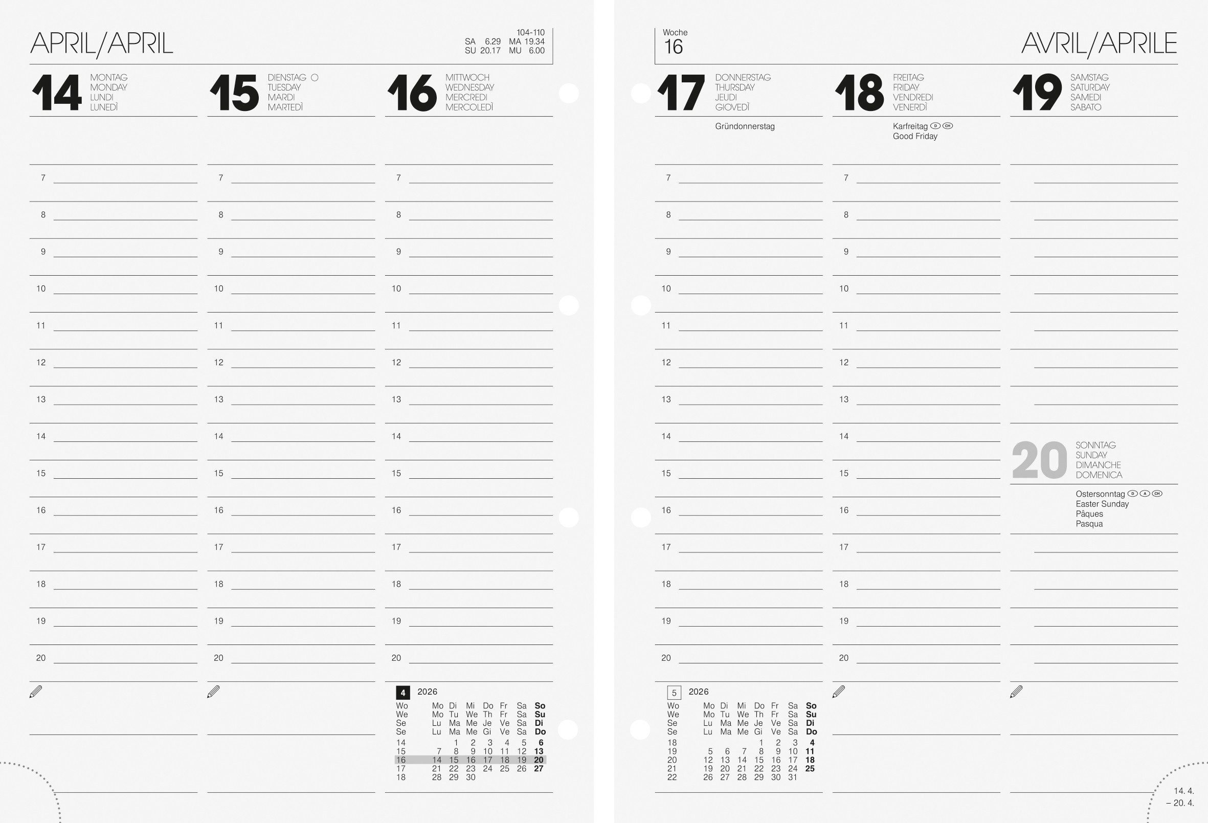 Brunnen Wochen-Ersatzkalendarium Mod. 796 2026 148×208 mm Einlage für Ringbuchkalender • Blattgröße: 148 × 208 mm • 2 Seiten = 1 Woche • 128 Seiten, Druckfarbe Kalendarium: schwarz • 70 g/m² • viersprachig: deutsch, englisch, französisch, italienisch • 4 Seiten Monatsplan aktuelles Jahr, 4 Seiten Folgejahr, Ferientermine Deutschland, Österreich, Frankreich und Luxemburg, 12 Seiten Wissenswertes • halbstündliche Einteilung von 7-20 Uhr, nicht Sa. und So. • Eckperforation • für Kalenderjahr 2026