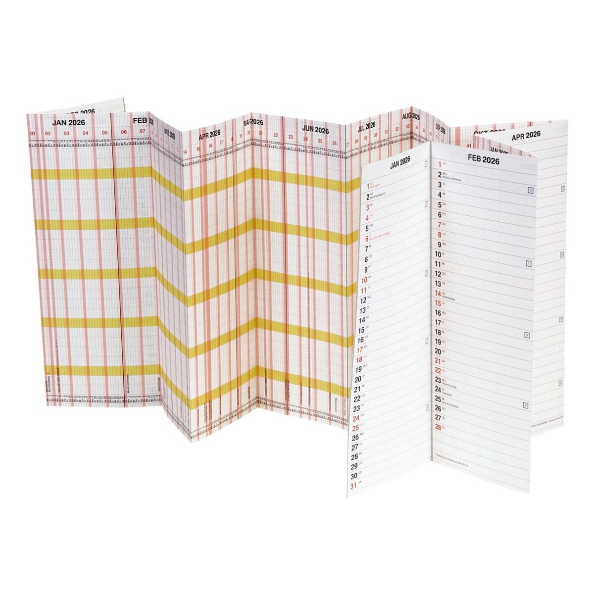 Universalplaner 2026, Kalendarium für die Urlaubs- und Projektplanung für zuhause oder das Büro, Ausführung: 1 Seite = 15 Monate, leporellogefalzt, für Maschineinsatz und Jahresstatistik geeignet, Kalendarium: dreifarbiger, beidseitiger Druck, für Urlaubs- und Projektplanung (bis zu 25 Personen), Vorderseite: Jahresübersicht mit Ferienterminen, Rückseite: Mitarbeitererfassung, Vierfachlochung, Maße gefaltet (B/H): 115x295 mm, Maße entfaltet (B/H): 1380x295 mm