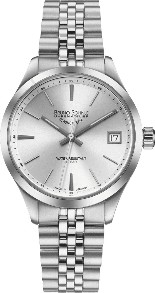 Die elegante Bruno Söhnle Damenarmbanduhr ist aus Edelstahl hergestellt und hat eine polierte sowie mattierte Oberfläche. Das silberfarbene Zifferblatt hat schmale Indexe und Zeiger, sowie eine datumsanzeige auf drei Uhr. Die Damen Uhr wird durch ein kratzfestes Saphirglas geschützt und ist bis zu 10 ATM wasserdicht. Durch die Faltschließe haben Sie einen sicheren und stabilen Verschluss. Gerne können Sie das Modell von Bruno Söhnle ohne Probleme zu jedem Outfit tragen.