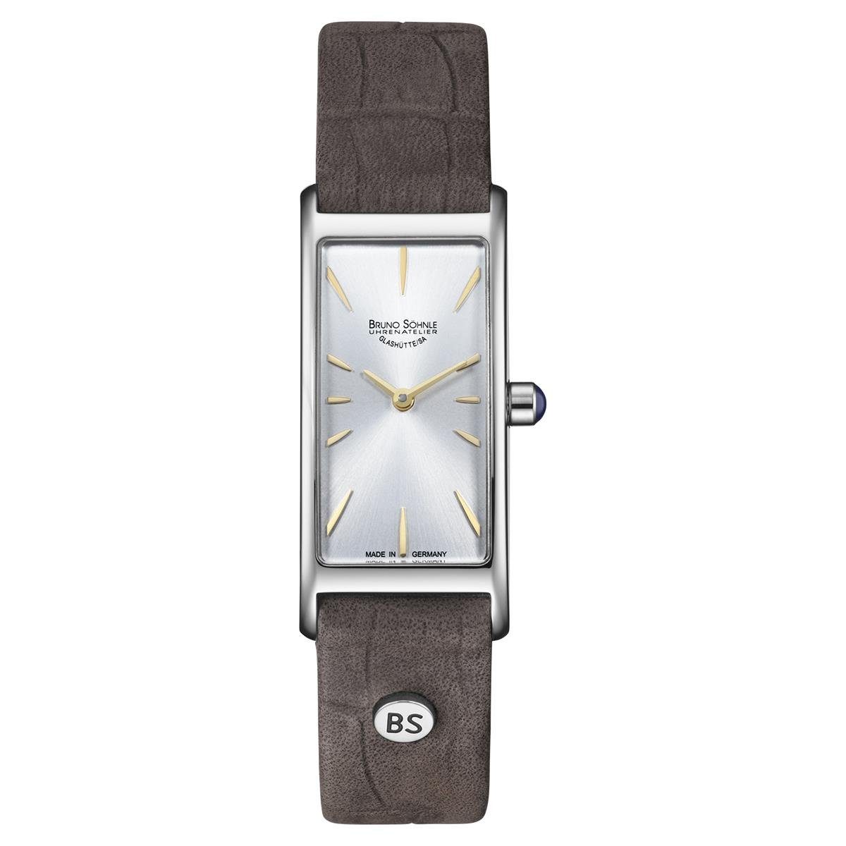 Die zeitlose Bruno Söhnle Damenarmbanduhr überzeugt durch schlichte Eleganz und einem klassischen Design. Das eckige Gehäuse sowie die Dornschließe sind aus Edelstahl hergestellt und haben eine polierte Oberfläche. Mit dem weichen und flachen Kalbslederband haben Sie auch einen sehr hohen Tragekomfort. Das helle Ziffernblatt ist schlicht gehalten mit schmalen, goldfarbenen Indexen und Zeiger. Dieses Uhren Modell ist aus der Nuvola III Kollektion von Bruno Söhnle und hat ein Quarz Werk in BS-Ausführung (Made in Germany) als auch ein kratzfestes Saphirglas.