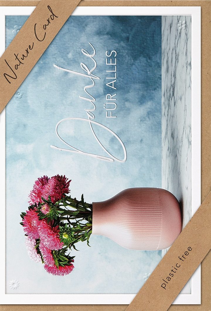 Nature Card -plastic free product- Ökopapier aus 50% recyceltem Zellstoff. Komplett frei von Plastik, FSC-Zertifizierung. Karten mit Briefumschlag, die nur durch eine Papierbanderole zusammengehalten werden. Ökologisch, nachhaltig, ressourenschonend! Selbst die Farben, die benutzt werden, sind mineralöl- und kobaltfrei und basieren nur auf nachwachsenden Rohstoffen!
