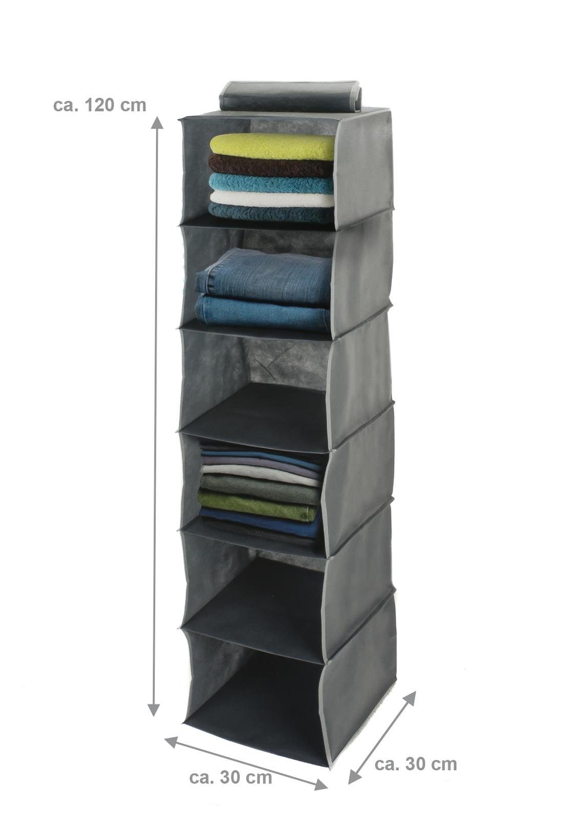 Ein faltbares Hängeregal sollte in keiner Wohnung fehlen. Bringen Sie Ordnung in Ihr Schuhwerk oder die Strickwaren. Der Organizer ist für Schuhe, Kleidung, Wäsche und sogar Strümpfe der ideale Aufbewahrungsort. Oben ist ein Aufhänger angebracht, dessen Klettverschluß über Kleiderständer, Schrankstangen oder ähnliches gefaltet wird. Die einzelnen Fächer haben einen verstärkten Boden. So lassen sich auch schwere Arbeitsschuhe unterstellen, ohne dass der Organizer seine Form verliert. Das leichte Hängeregal ist aus abwaschbarem Kunstfasermaterial. Es misst ca. 120 cm in der Höhe und verfügt über 6 Fächer, die innen (HxBxT) je ca. 18 x 28 x 30 cm groß sind. Der Organizer ist in schlichtem grau gehalten, passt daher farblich zu allen Einrichtungsstilen. Und sollten Sie Ihr neues Hängeregal mal nicht mehr benötigen, lässt es sich in sekundenschnelle zusammenlegen und auf kleinstem Raum lagern. Wofür Sie Ihr neues Hängeregal auch nutzen, es wird Sie garantiert nicht im Stich lassen. Wir wünschen viel Freude daran.