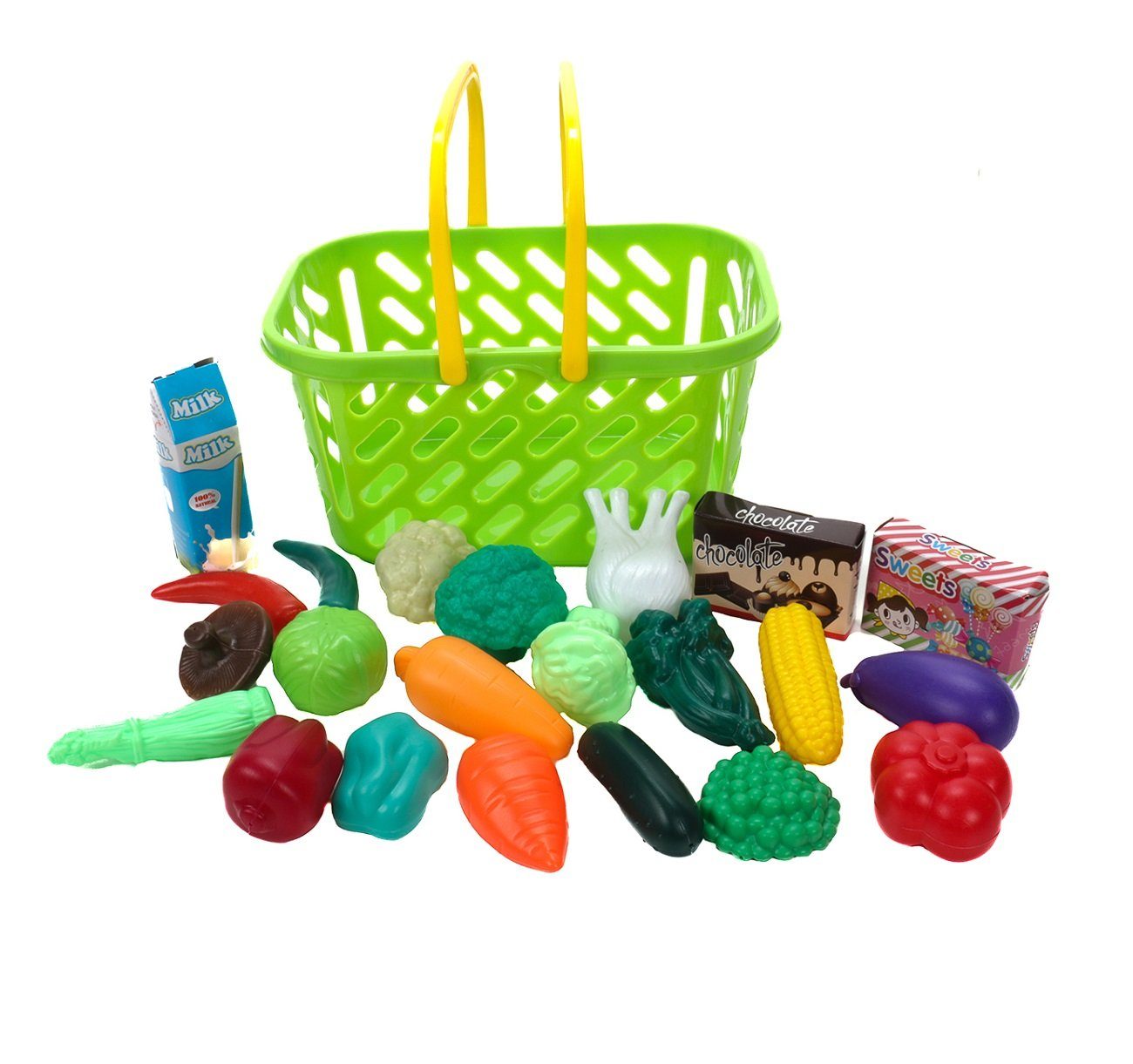 Kinder imitieren die Erwachsenenwelt und lernen beim Nachspielen unseres Alltags. Dazu gehört selbstverständlich auch das Einkaufen. Mit dem Kinder-Einkaufskorb inklusive Warensortiment kann Ihr Nachwuchs jetzt im Kinderzimmer die ersten Einkaufstouren üben. Und als tolle Ergänzung zum Kaufmannsladen ist er natürlich auch allererste Wahl. Aber mit etwas Phantasie geht es natürlich auch so. Der grüne Einkaufskorb verfügt über zwei gelbe, herunterklappbare Tragegriffe. Im Warensortiment befinden sich 19 verschiedene Gemüse-Arten aus Kunststoff sowie eine Milchpackung und zwei Warenkartons, die Sie mit etwas Leckerem befüllen können. Mit seinem neuen Kinder-Einkaufkorb mit Warensortiment lernt Ihr Kind auf spielerische Art und Weise den Alltag zu meistern. Und ganz fix kann Ihr Nachwuchs auch beim echten Einkauf mit seinem schicken Kindereinkaufskorb helfen. Wir wünschen allen Beteiligten viel Spaß dabei!