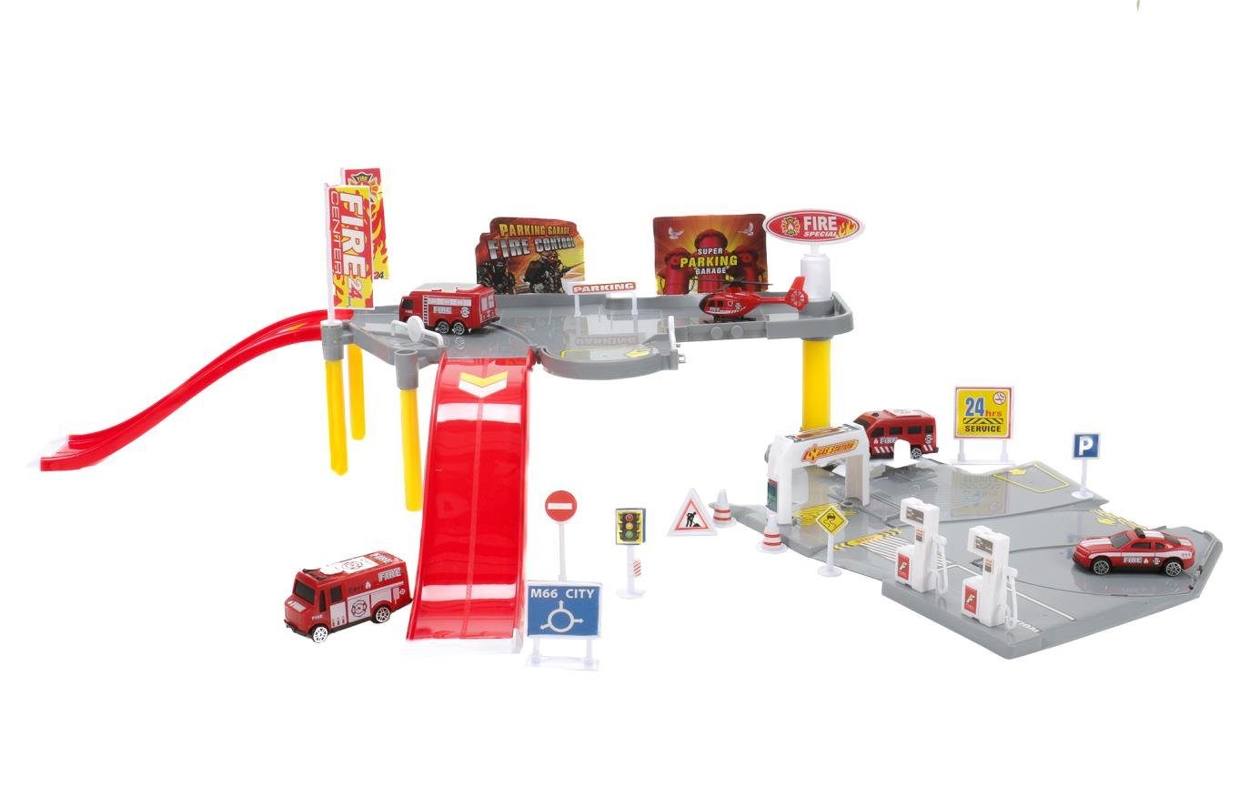 Mit diesem 2-stöckigen Polizei-Garagen Spiel-Set werden Sie jedem kleinen Autofan eine Riesenfreude machen. Der dazugehörige Fuhrpark besteht aus 3 Transportern, einem Hubschrauber, dessen Flügel zusammengeklappt werden können und einem Pkw-Einsatzwagen. Von dem oberen Parkdeck gehen 2 Rampen ab, zum rauf- bzw. runterfahren. Außerdem ist eine Parkfläche sowie der Hubschrauberlandeplatz auf der ersten Etage. Darunter befindet sich eine weitere Spielplatte, die mit der oberen verbunden ist. Sie kann sowohl unter die erste Etage als auch dahinter gedreht werden. Auf der unteren Ebene befindet sich eine Tankstelle mit 2 Zapfsäulen, eine kleine Hebebühne sowie eine stilisierte Waschstraße. Dazu gehören 8 Schilder, die beidseitig mit den im Zubehör liegenden Abziehbildern beklebt werden können, so das 16 verschiedene Straßenschilder im Spiel sind. Beim Aufbau der Garage und Bekleben sollte ein Erwachsener helfen, da die Klebebilder, sind sie einmal befestigt, nicht so einfach wieder abzulösen sind. Außerdem gibt es 2 Schranken sowie 2 große Flaggen u.v.m.. Das gesamte Spielset besteht aus Kunststoff, ist daher einfach zu reinigen und für drinnen und draußen spielbar. Wir wünschen Ihnen viel Spaß beim Schenken und Ihrem kleinen Mini-Polizeibeamten viel Spaß beim Spielen!