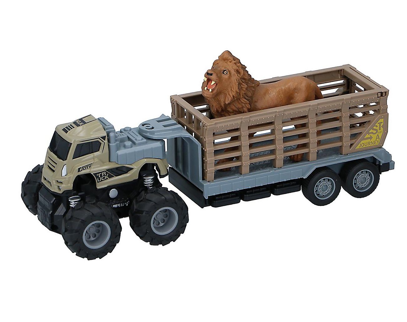 Lieferumfang | 1x 2 in 1-Spielzeug Tiertransporter mit Anhänger mit Friktionsantrieb, 1x Ladung: Löwe |