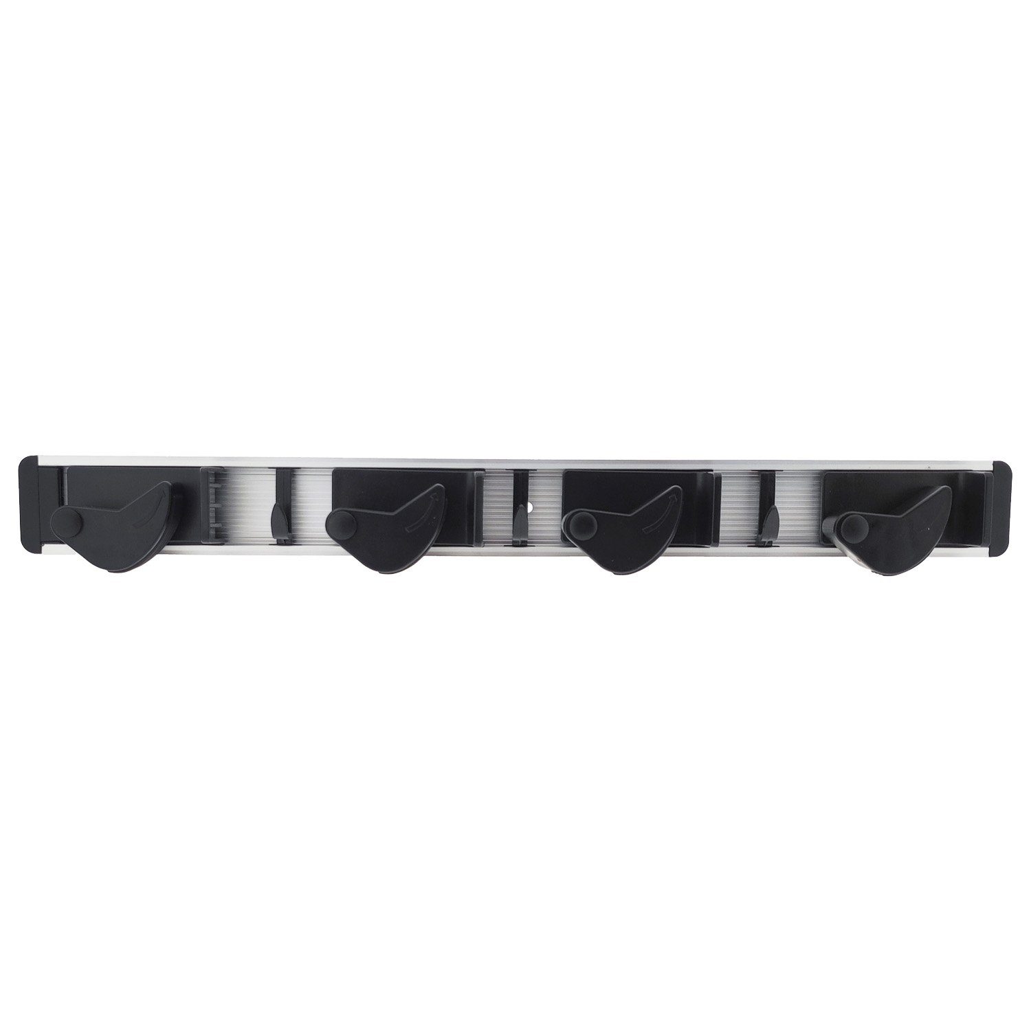 Der Gerätehalter ist perfekt für Gartengeräte in der Garage. Auch der Besen oder der Wischmopp findet an der Hakenleiste platz. In die Klemmhaken können Geräte mit einem Stiel von bis zu einem Durchmesser von 30 mm eingehängt werden. An den 3 Haken ist Platz für Kleingeräte oder den Putzlappen.