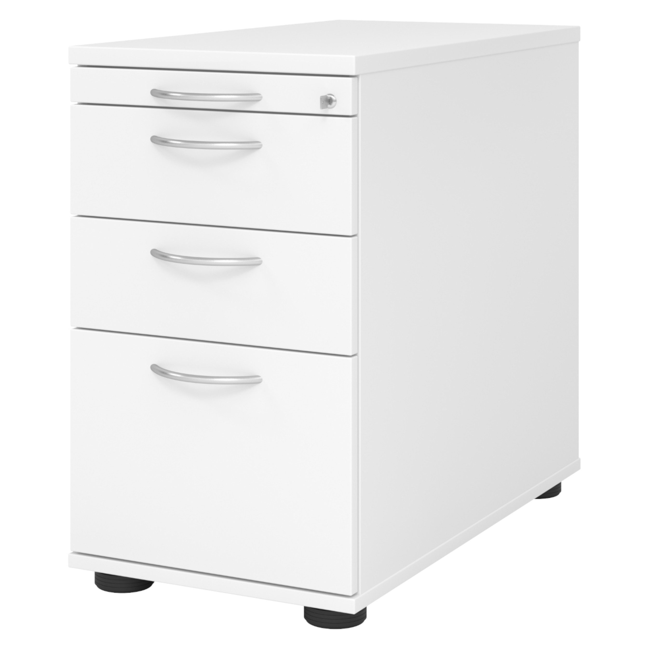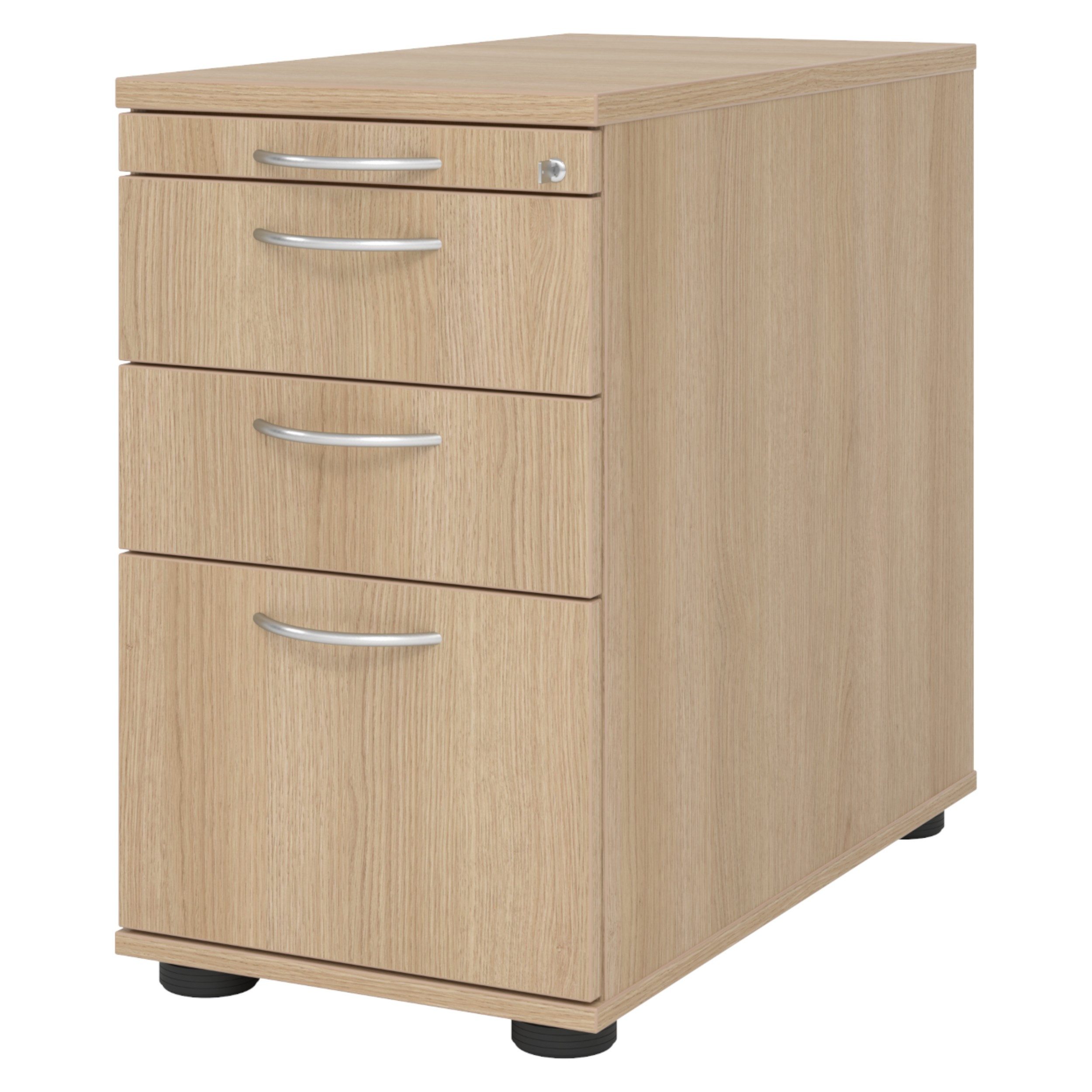 Der bümö® Office Standcontainer ist der perfekte Assistent in Ihrem Büro. Drei Schubladen bieten ausreichend Platz für alle wichtigen Büromaterialien des täglichen Gebrauchs sowie Hängemappen. Schreibwaren, Notizzettel, Taschenrechner und Scheren können in der obersten Schublade (Utensilienschublade) untergebracht und eingeordnet werden. Впередhin verfügt der Container über viele Funktionen die im Büroatlag maximalen Komfort bieten. Perfekt für die Schreibtischvergrößerung mit zusätzlichem Stauraum.