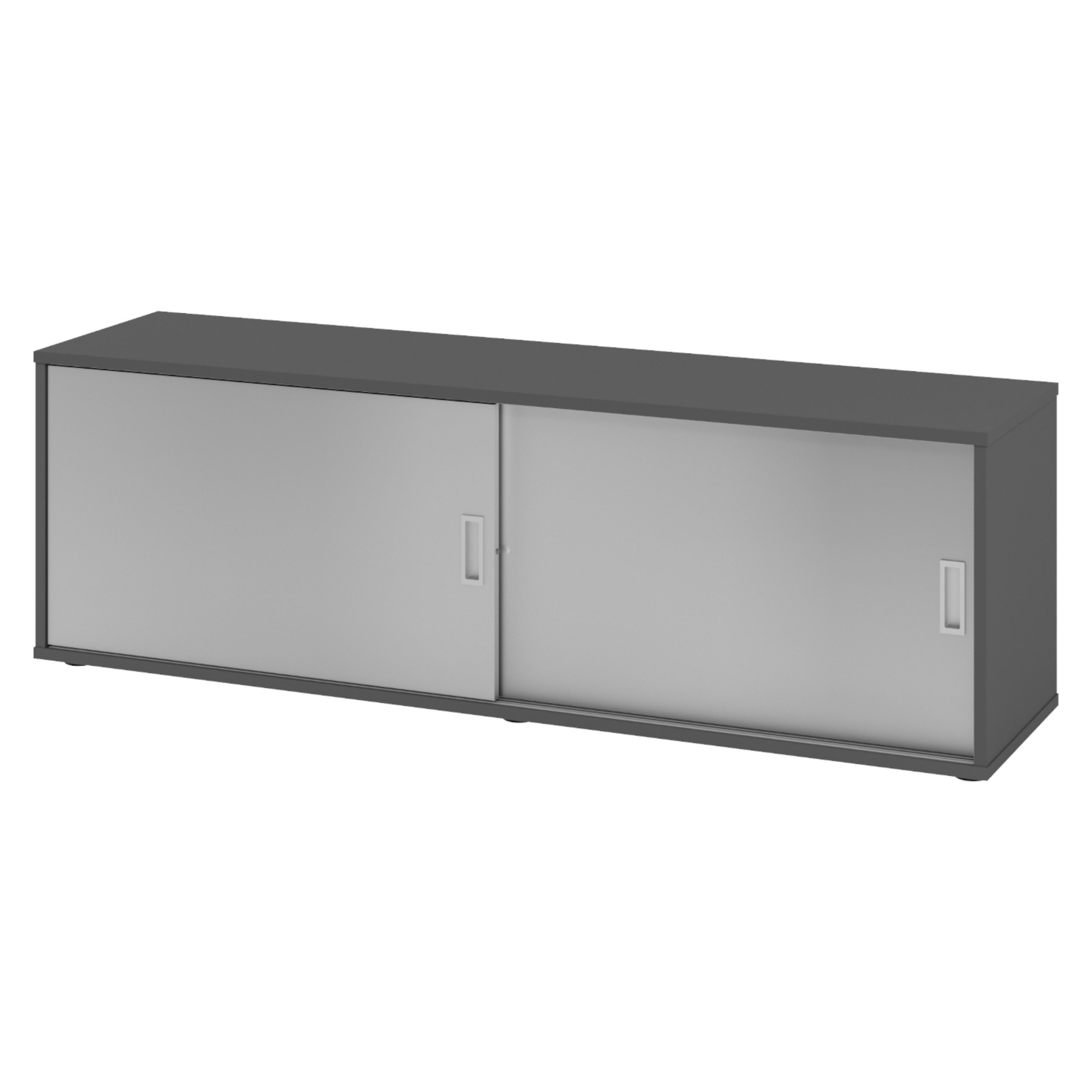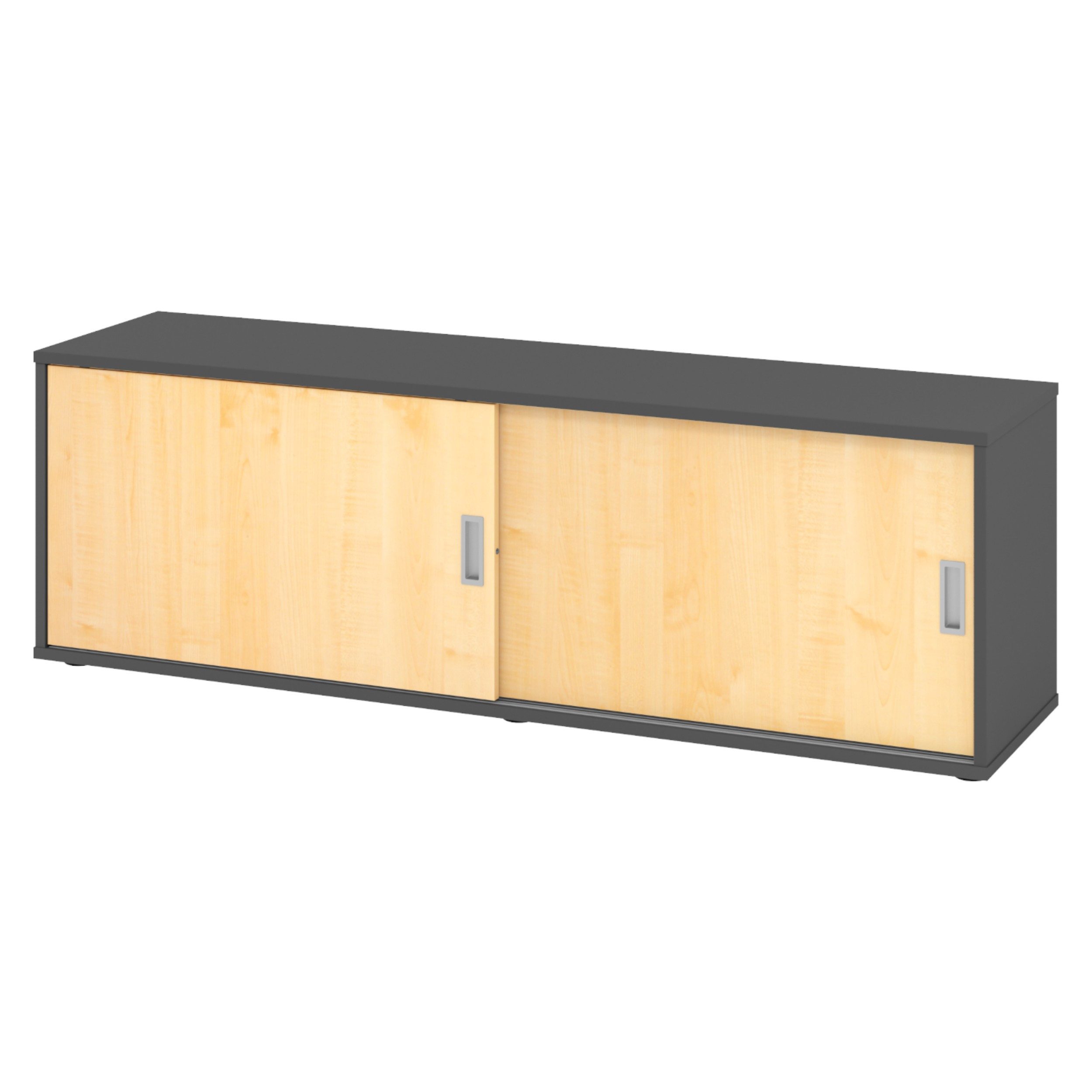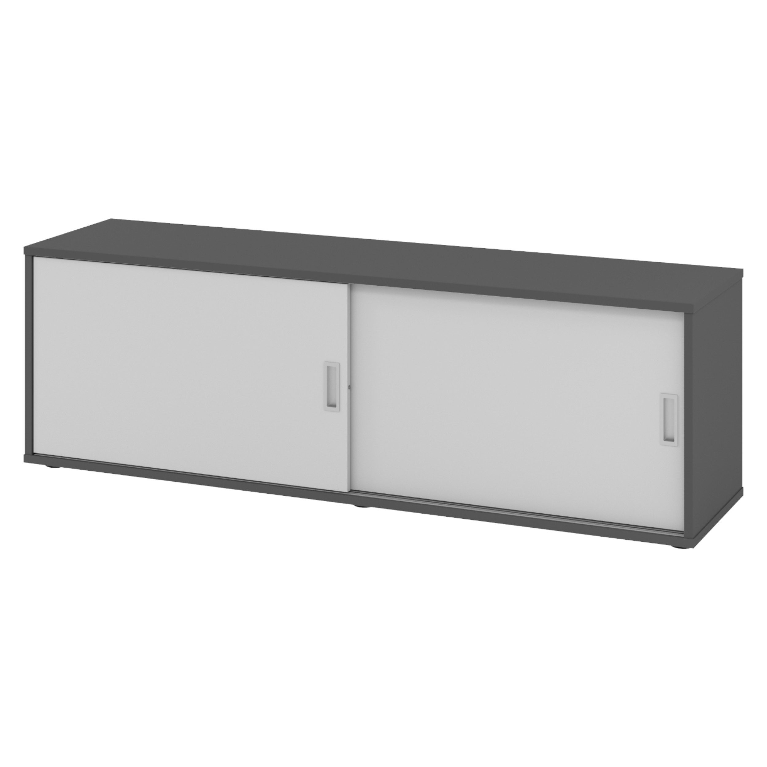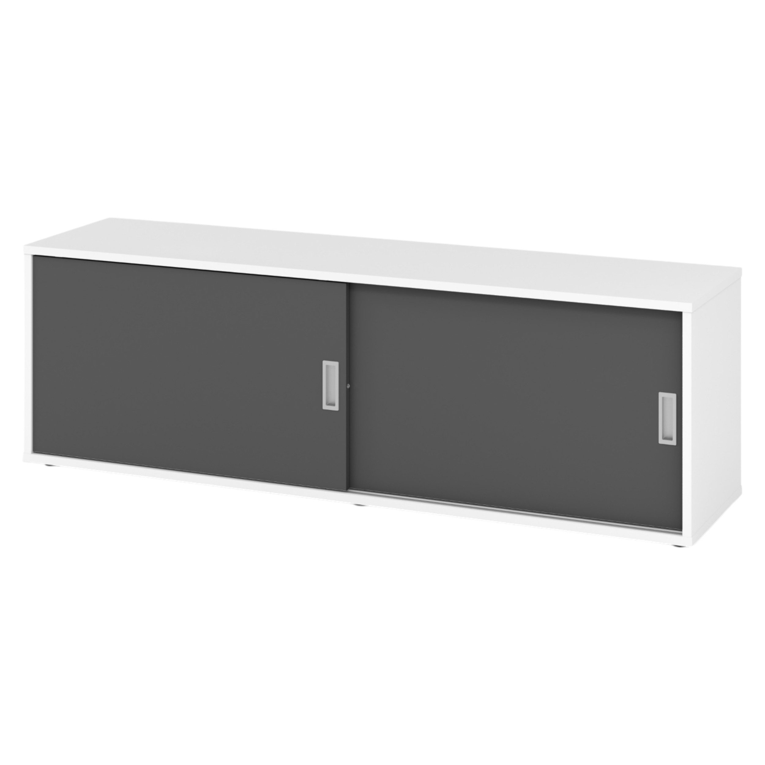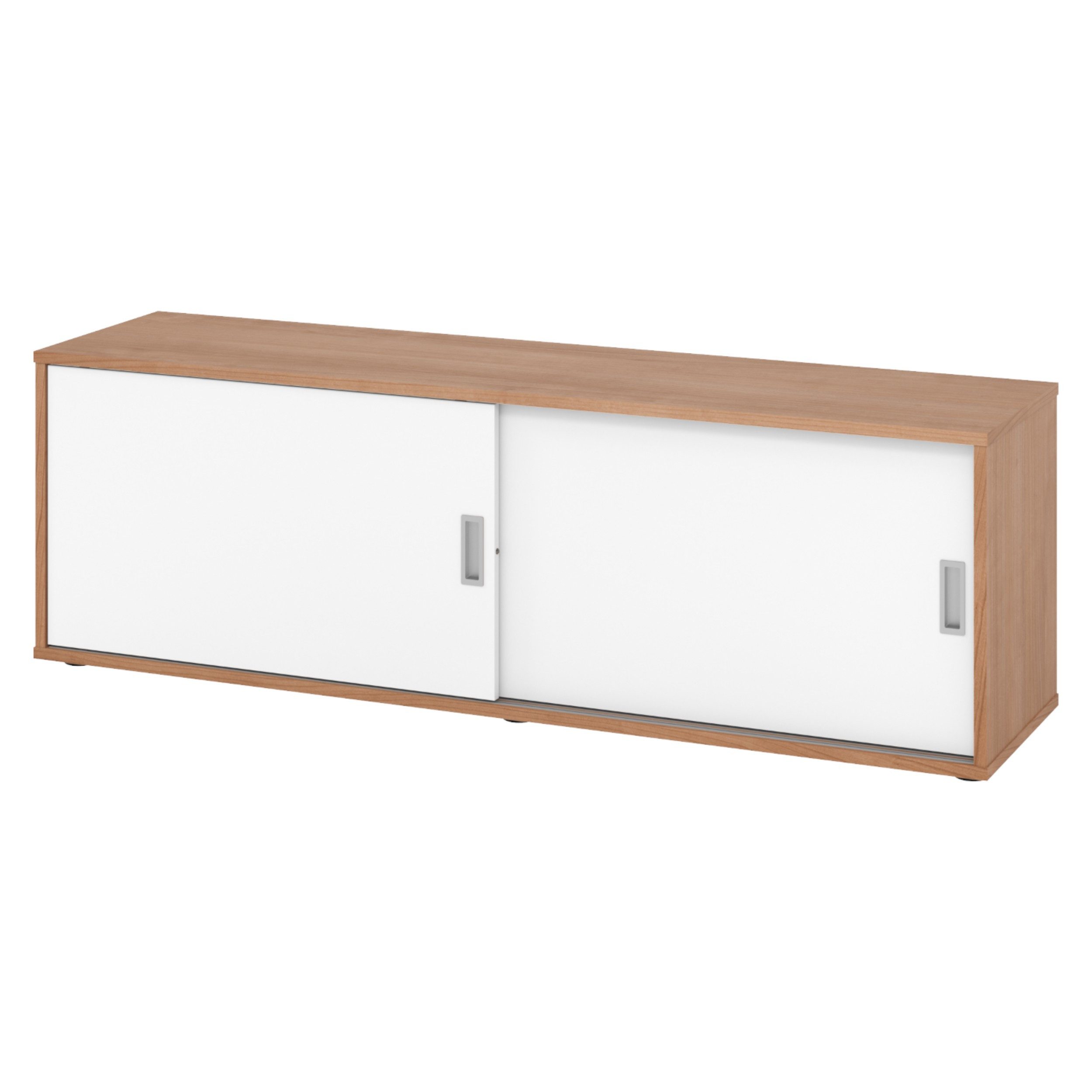 Das bümö office Lowboard mit Schiebetüren vereint hochwertige Verarbeitung, durchdachte Funktionalität und ein zeitloses Design – ideal für den professionellen Büroalltag. Mit seiner niedrigen Bauhöhe fügt sich das Sideboard dezent in jede Arbeitsumgebung ein und bietet dabei großzügigen Stauraum für Akten, Unterlagen oder Büromaterial. Die Ausstattung mit höhenverstellbaren Fachböden, einer stabilen Mitteltrennwand sowie einer Sichtrückwand im Korpusdekor macht das Möbelstück vielseitig einsetzbar – sowohl an der Wand als auch freistehend im Raum.