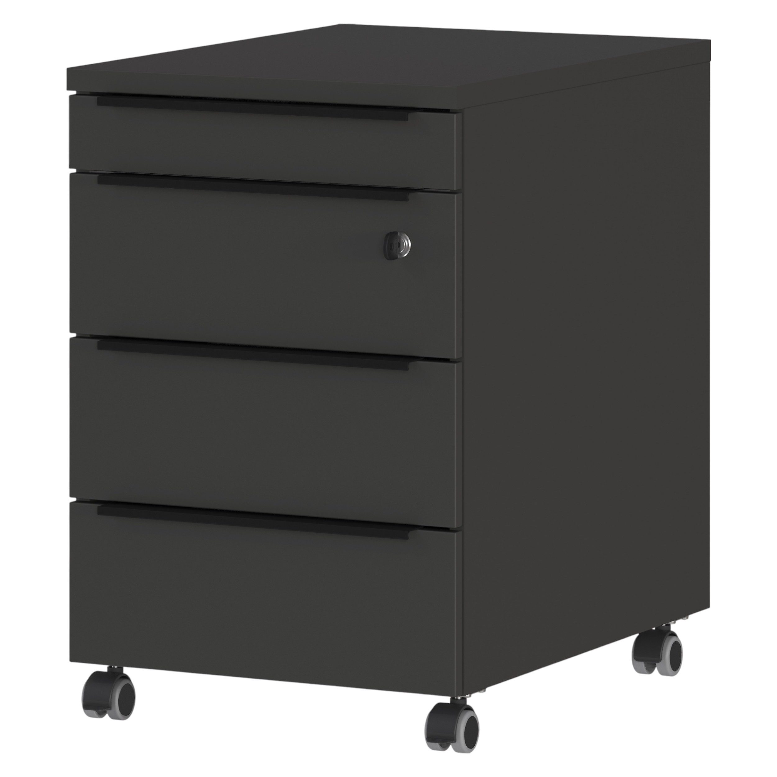 Ausstattung | Abschließbar Schubladen mit Dämpfungssystem Metall-Kantengriffe in elegantem Schwarz mit Stiftablage, 4 gummierte Rollen, 2 davon feststellbar gewerbetauglich |