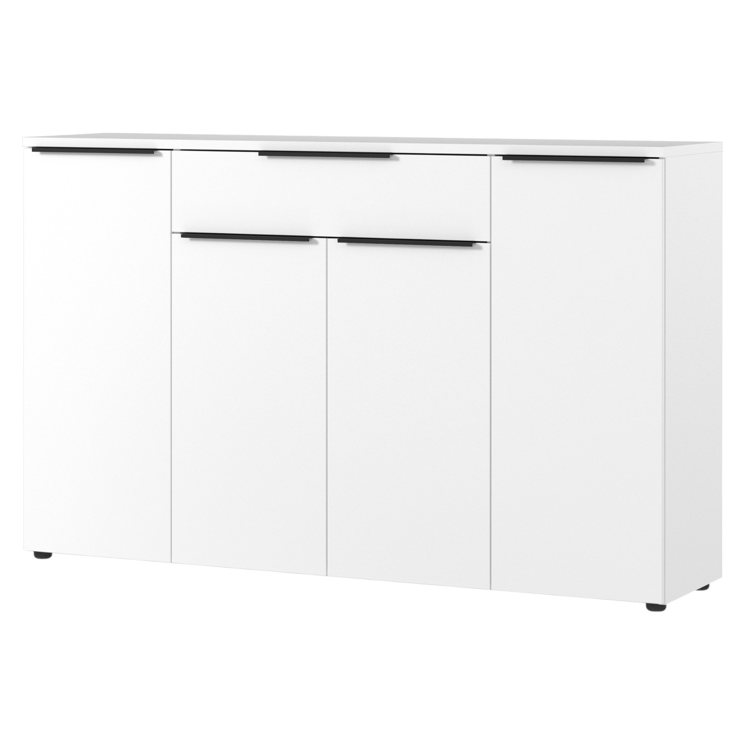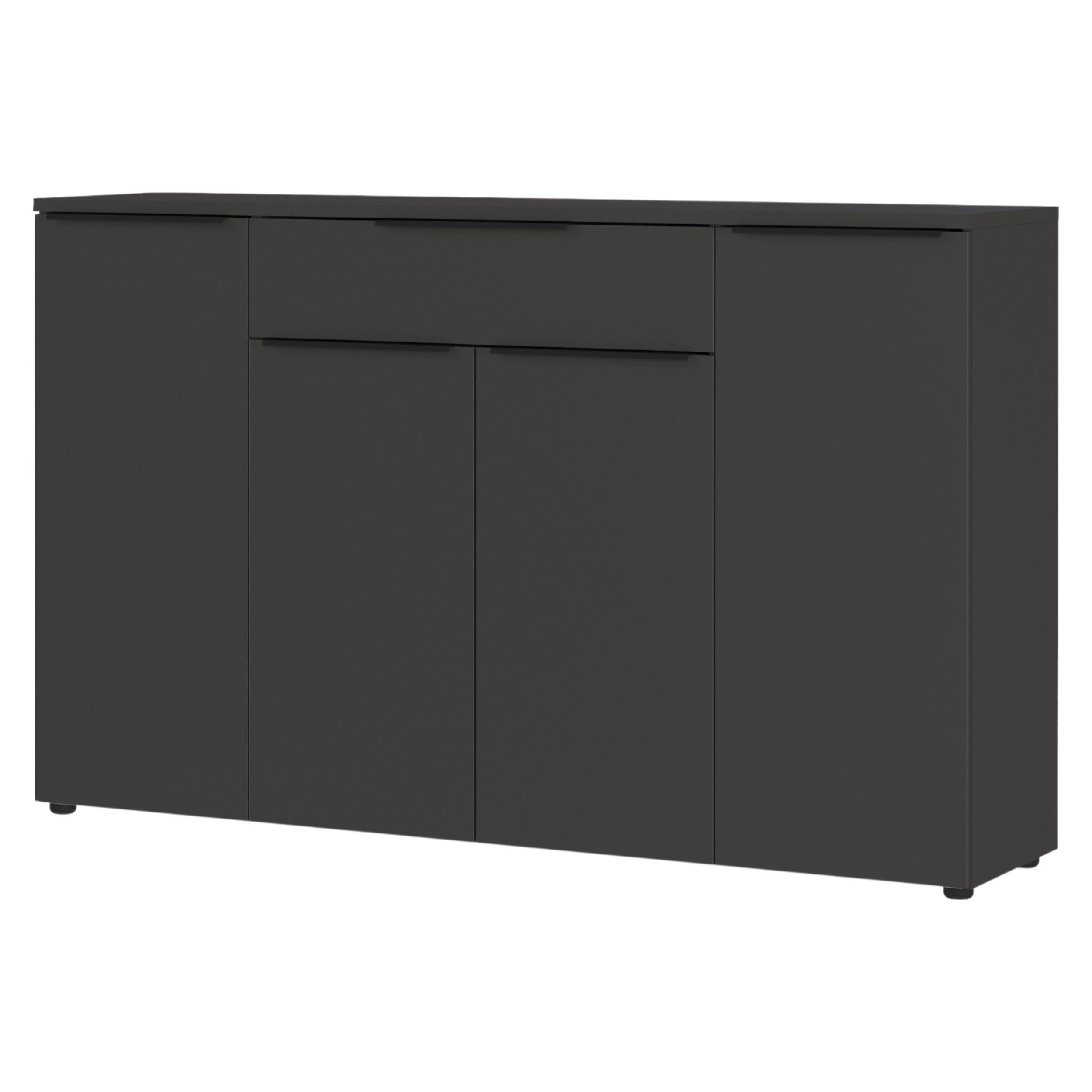Ausstattung | Leise Türen & Schublade mit integrierter Dämpfungsfunktion 5 einstellbare Fachböden mit je 10 kg belastbar ABS-Kanten aus Kunststoff für höchste Langlebigkeit Beschichtete Oberflächen: wasserabweisend & pflegeleicht Pulverbeschichtete Metallgriffe in schwarz |