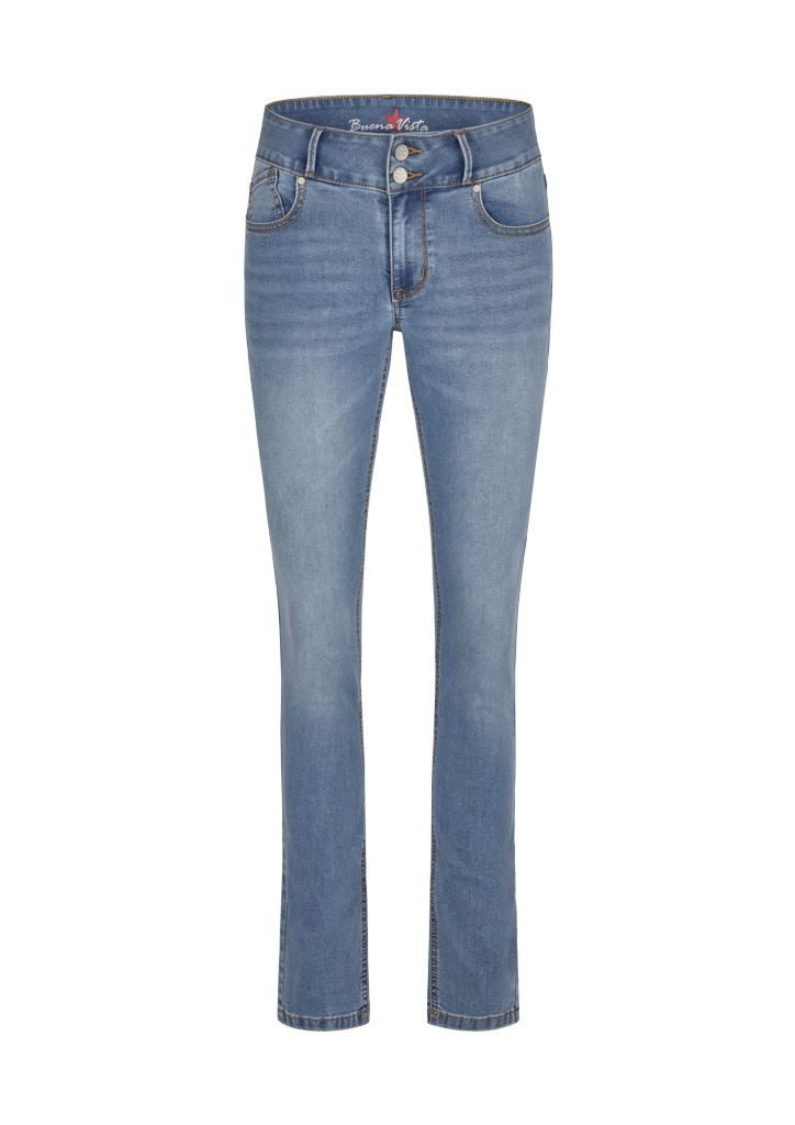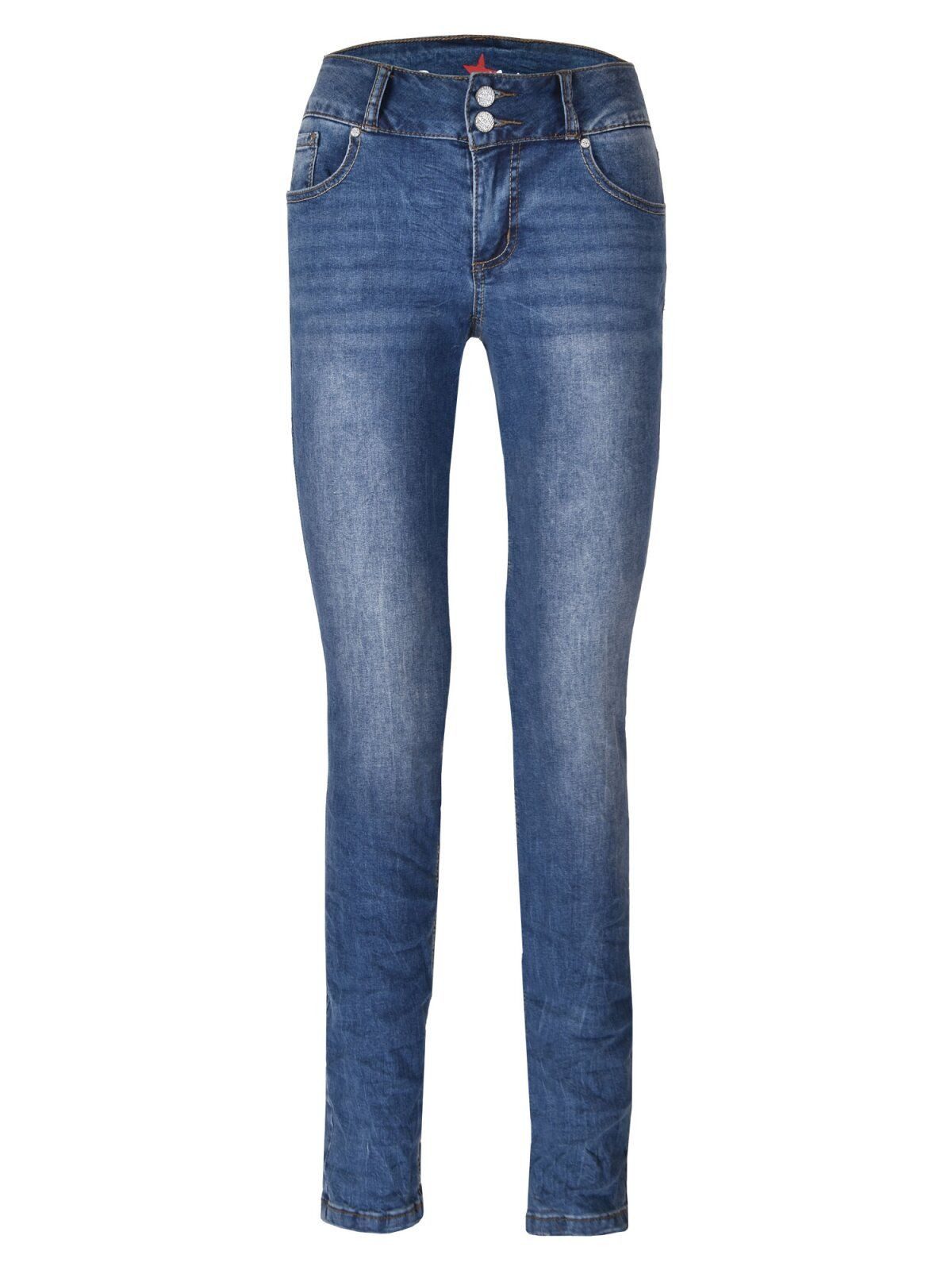 5 Pocket Stretch Denim, Skinny Fit (Slim Fit), mittlere bis höhere Leibhöhe, doppelte Knöpfe im Bund, Reißverschluss