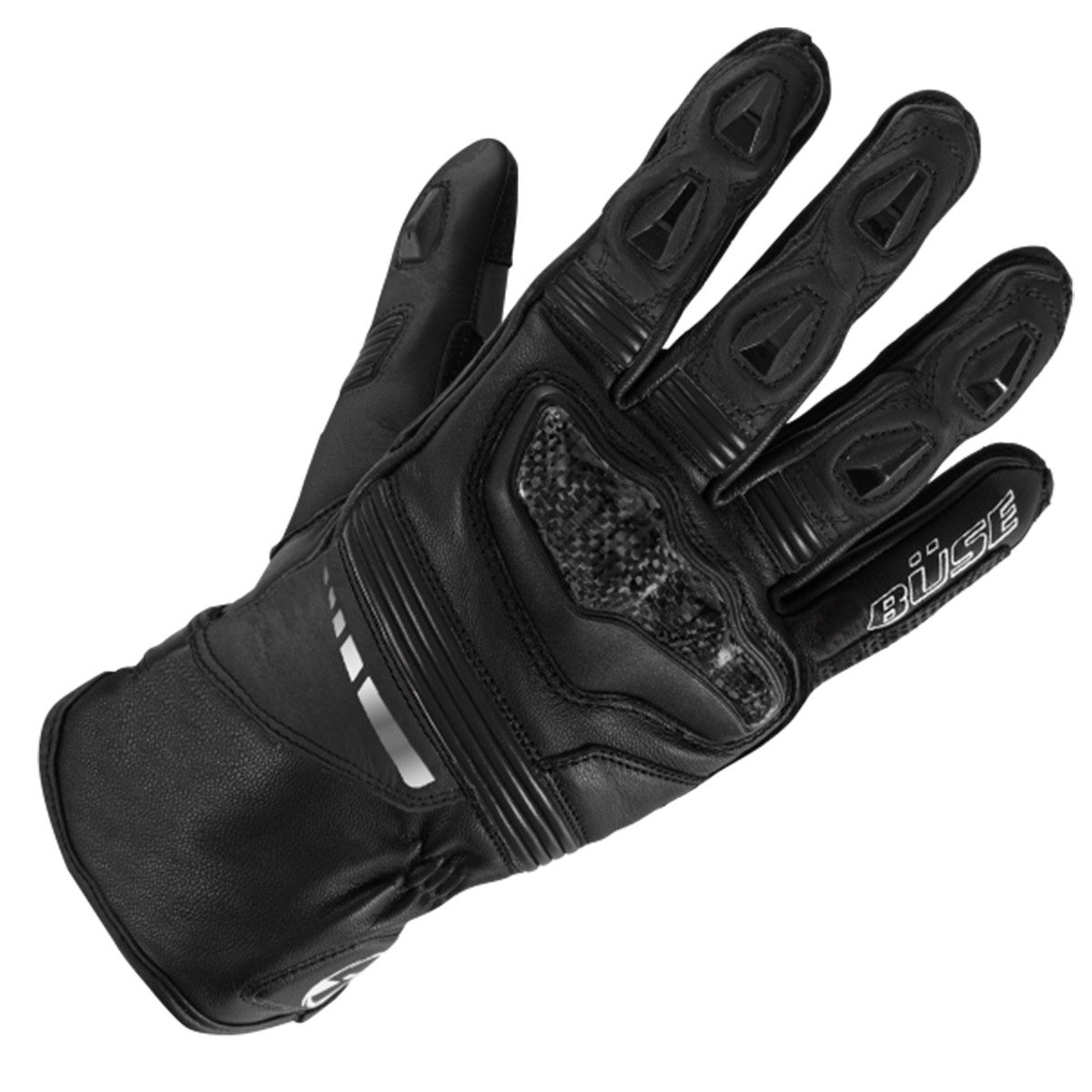 Sportliche Handschuhe mit langen Stulpen, Carbon-Hartschale über den Handknöcheln, elastischem Textilgewebe für mehr Beweglichkeit, Touch-Screen-Funktion und Reflexelementen.