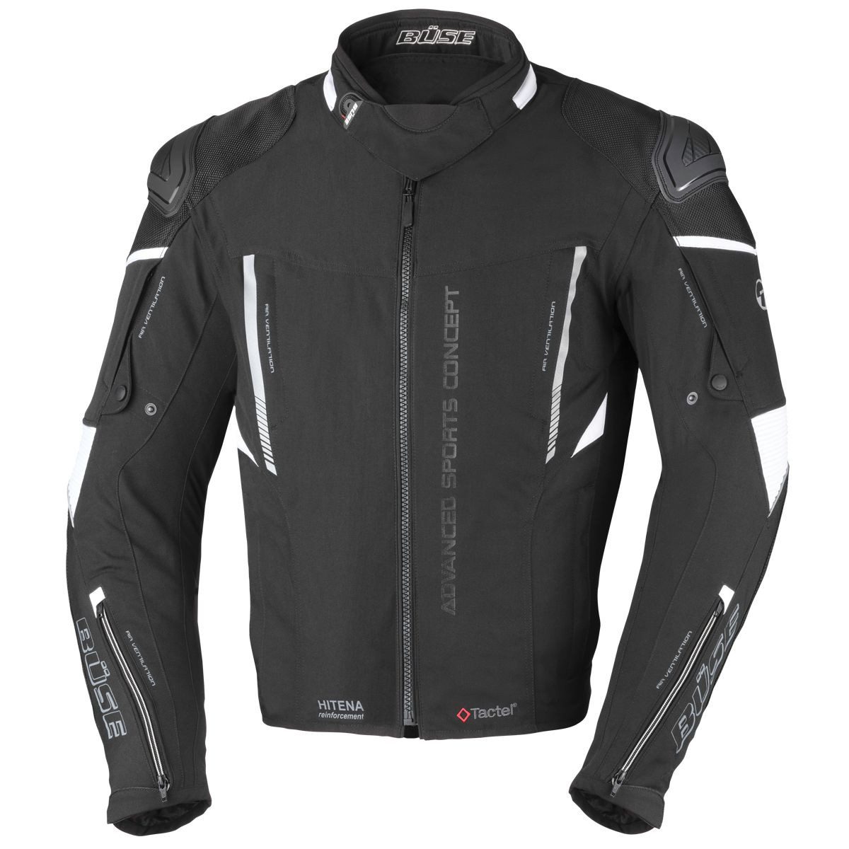 Die Motorradjacke von Büse besteht aus strapazierfähigem Tactel-Gewebe und wird durch Hitena-Einsätze an Schultern und Ellbogen sowie einer entnehmbaren Humax-Klimamembrane ergänzt. Sie ist somit die ideale Lösung für Fahrer, die besonderen Wert auf Sicherheit und technische Raffinesse legen.