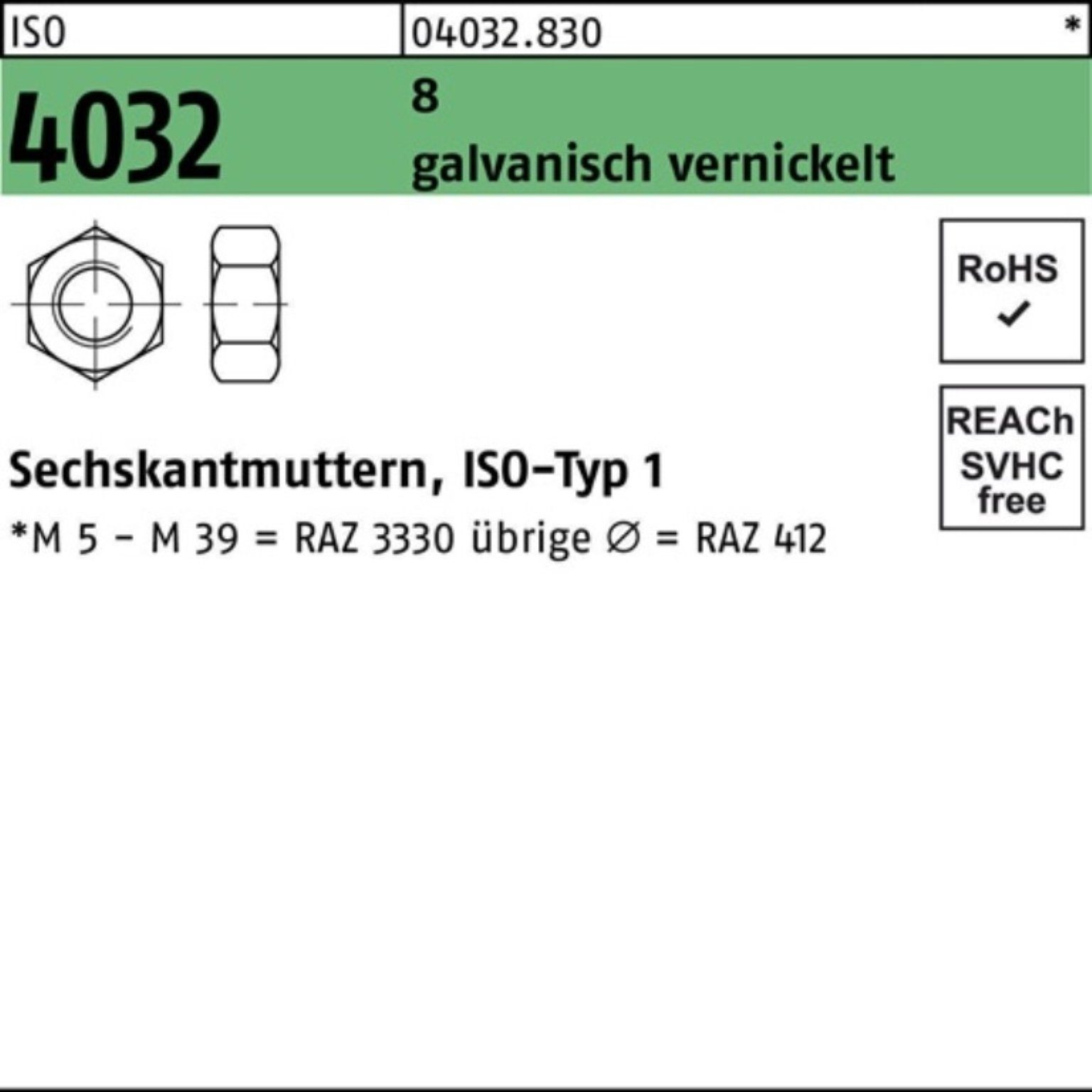 Sechskantmutter ISO 4032 M4 8 galv. vernickelt 1000 Stück ISO 4032 8 galvanisch vernickelt Sechskantmuttern · ISO-Typ 1 - Abmessung: M 4 VE=S (1000 Stück) Впередe technische Eigenschaften: · Gruppencode: 04032.830