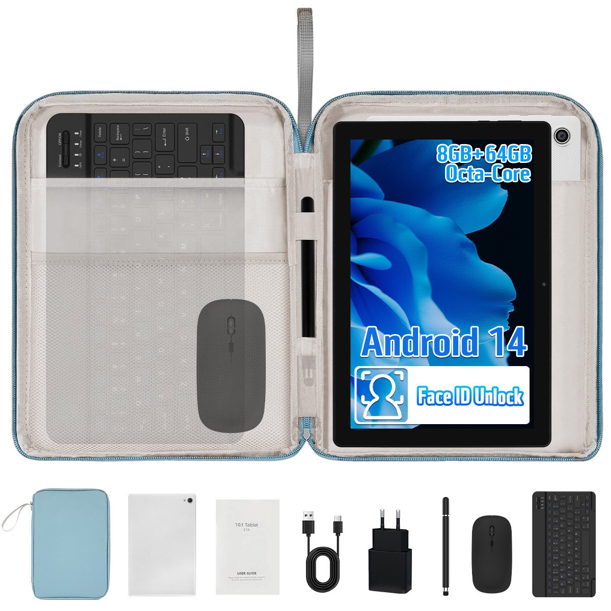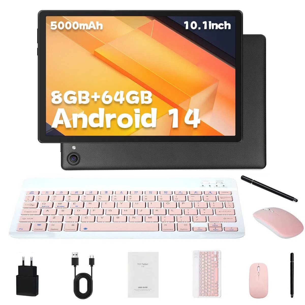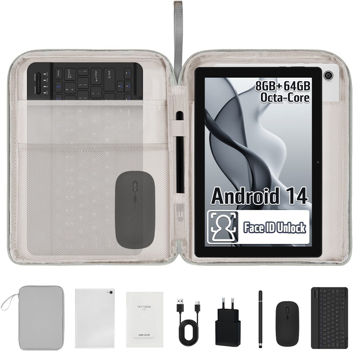 Android 14 Tablet 10 Zoll Komplettset mit Tastatur, Maus & Stift | 8GB RAM + 64GB ROM + 1TB erweiterbar | Widevine L1 | OTG & Split-Screen