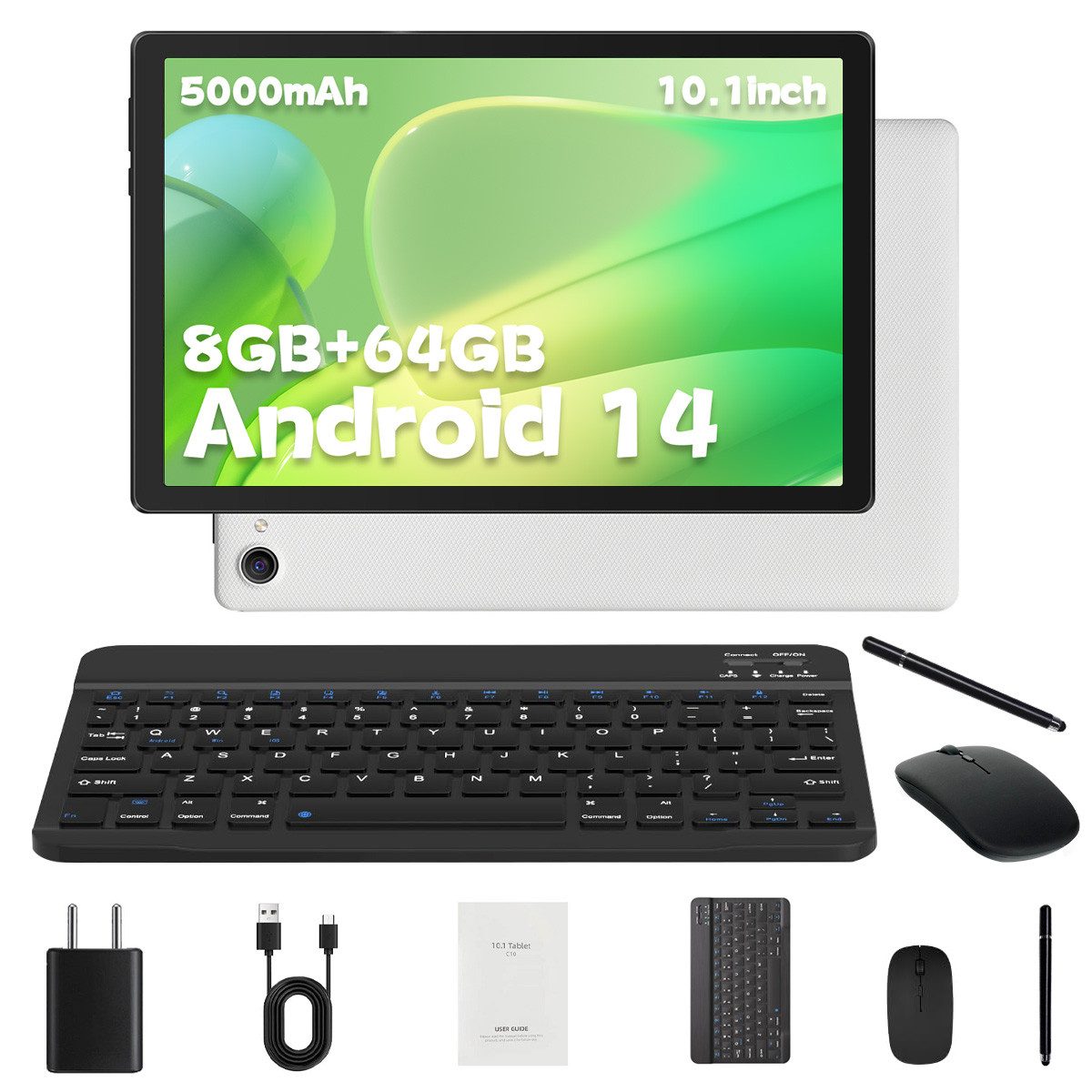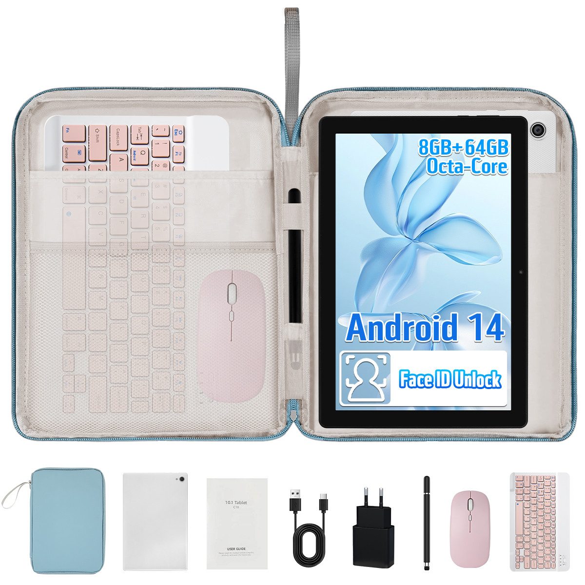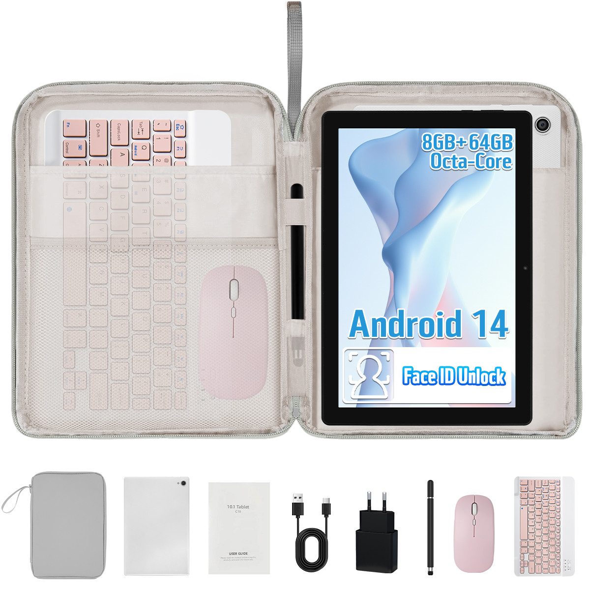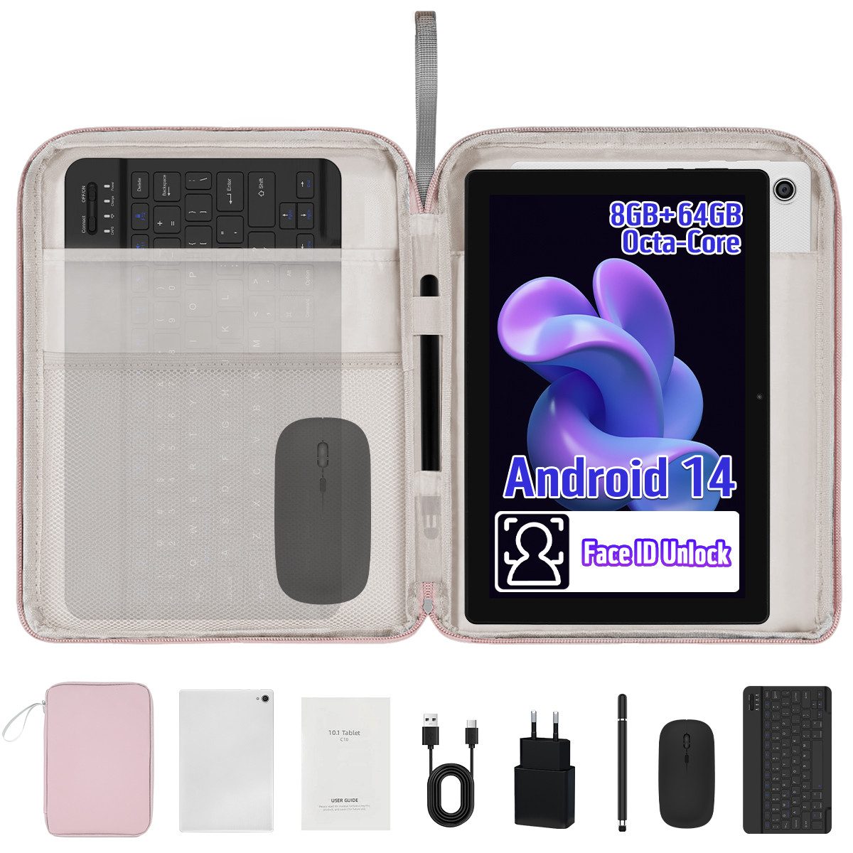 Android 14 Tablet 10 Zoll Komplettset mit Tastatur, Maus & Stift | 8GB RAM + 64GB ROM + 1TB erweiterbar | Widevine L1 | OTG & Split-Screen
