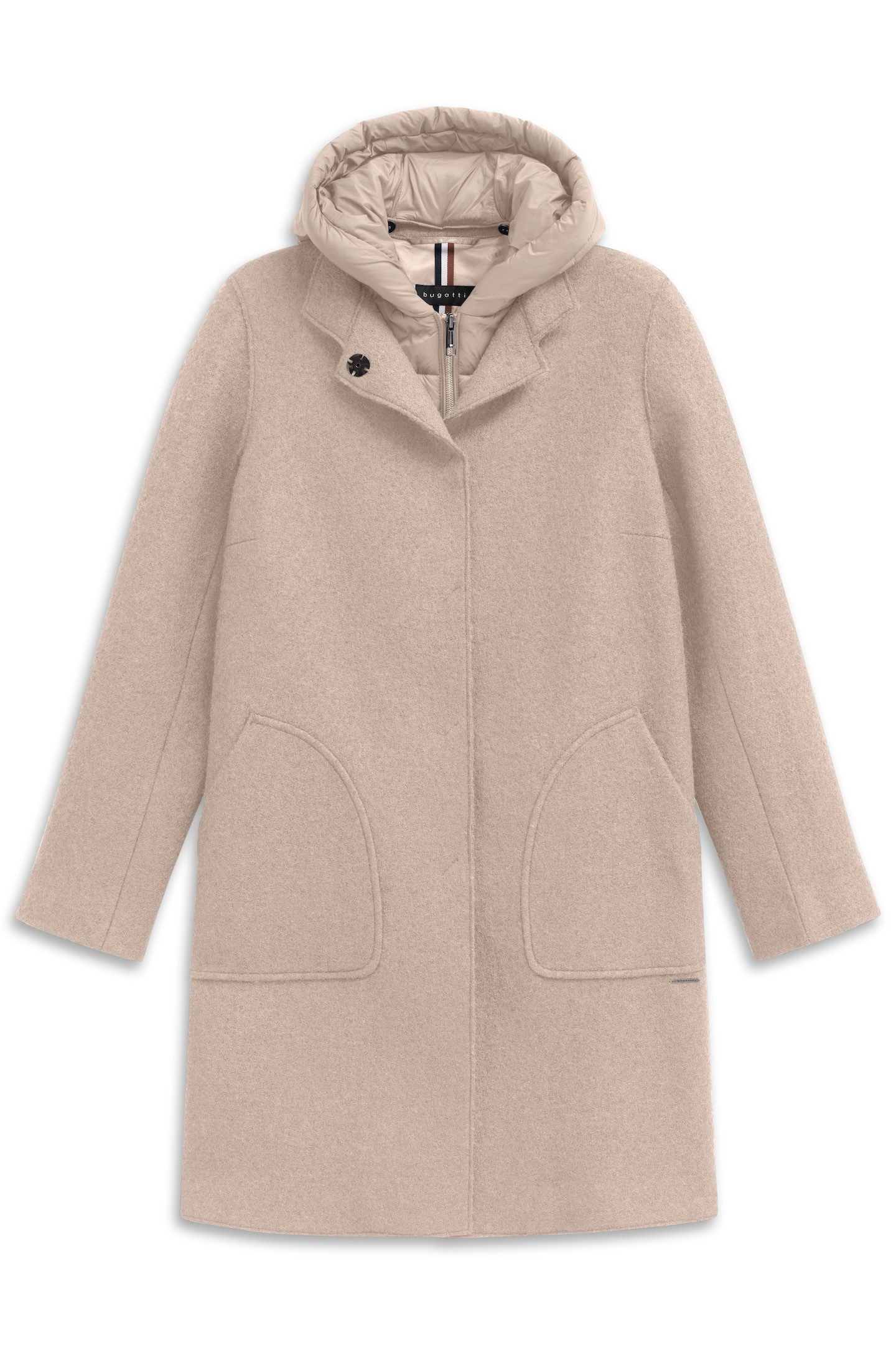 Dieser bugatti Wollmantel vereint modernes Design mit praktischer Vielseitigkeit und höchstem Tragekomfort. Der Modern Fit sorgt für eine feminine Silhouette, die sich perfekt zu Jeans, Business-Outfits oder Kleidern kombinieren lässt. Dank Flexcity Stretch genießt du angenehme Bewegungsfreiheit, während die gekochte Wolle dich zuverlässig warm hält und dem Mantel eine edle Optik verleiht. Besonders durchdacht ist der herausnehmbare Westen-Fake-Einsatz mit eigener Kapuze, den du je nach Wetterlage flexibel ein- oder auszippen kannst – so passt sich der Mantel deinen Bedürfnissen an und bietet dir immer das richtige Maß an Wärme. Ein hoher Stehkragen schützt dich zusätzlich vor Wind, während die Kombination aus verdecktem Reißverschluss und Druckknöpfen für einen modernen, cleanen Look sorgt. Zwei aufgesetzte Taschen und eine praktische Innentasche bieten Platz für Smartphone, Schlüssel oder andere Kleinigkeiten. Die offenkantige Verarbeitung unterstreicht den modischen Charakter und verleiht dem Mantel einen hochwertigen, trendbewussten Touch. Wenn du Wert auf Qualität, Funktionalität und zeitlose Eleganz legst, ist dieser bugatti Wollmantel genau die richtige Wahl für dich.