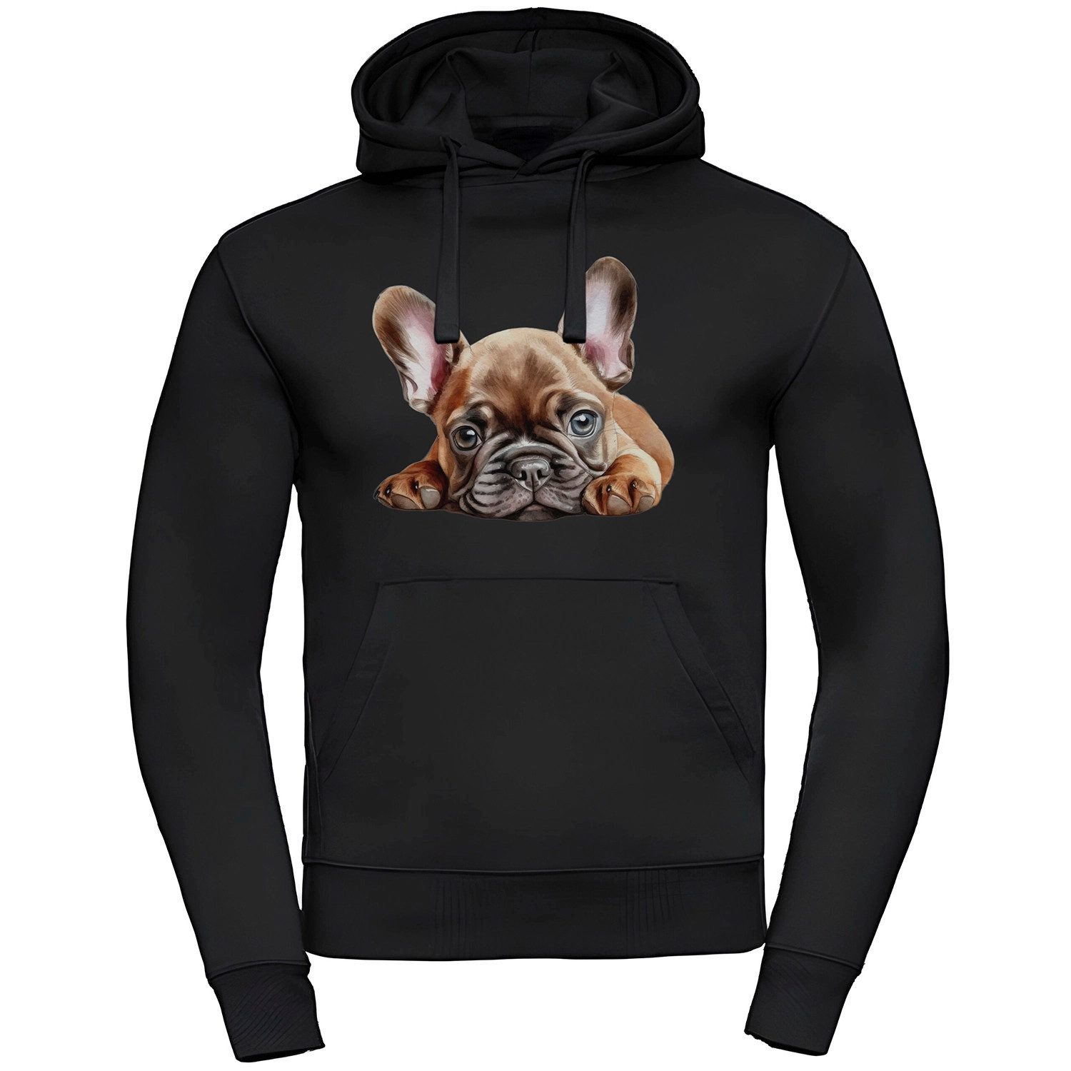 DESIGN: Stilvoller schwarzer Hoodie mit künstlerischem French Bulldog Motiv in beige und hellblau