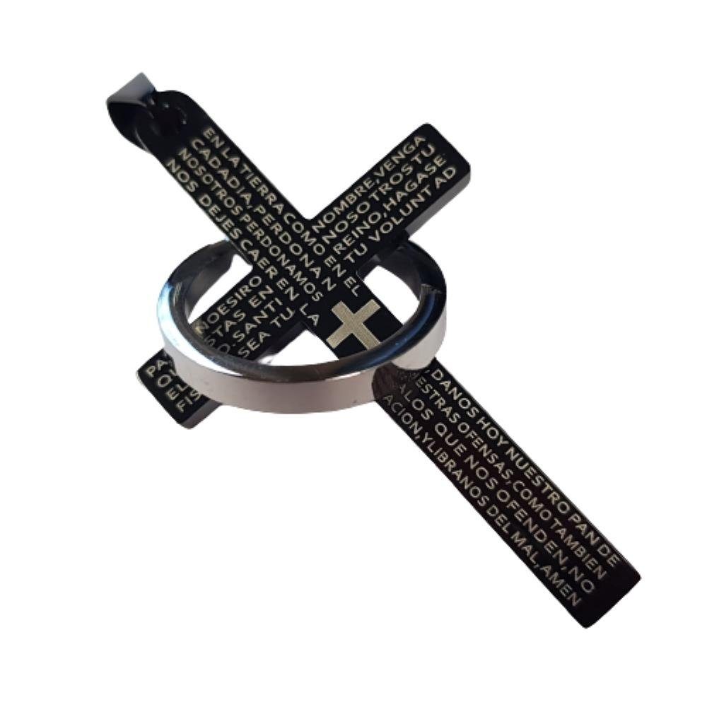 Schwarzes Kreuz-Anhänger mit silberfarbenem Ring und Gebetstext (spanisch) aus 316L Edelstahl
