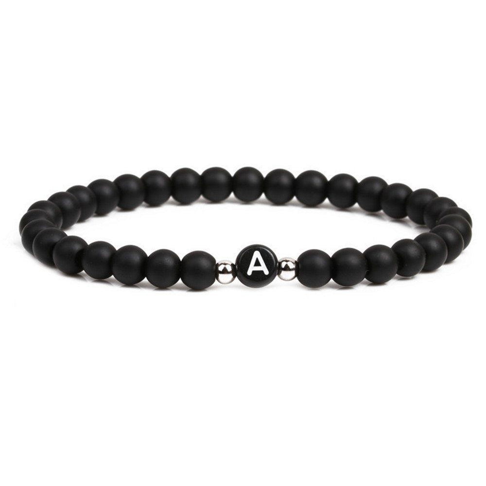 Buchstaben- Armband mit schwarzen Lavastein-Perlen und einem Buchstaben Ihrer Wahl - Erhältlich wahlweise mit den Buchstaben: A, B, C, D, E, F, G, H, I, J, K, L, M, N, O, P, Q, R, S, T, U, V, W, X, Y, Z | Der Lavastein ist sehr leicht. Er nimmt die Körpertemperatur an, wenn er auf der Haut liegt. Es entsteht ein besonders gutes Tragegefühl. Als Schutzstein stabilisiert der Lavastein Energien und bewahrt vor körperlichem wie auch vor emotionalem Schaden. Die Natursteine sind mit einem stabilem Gummiband befestigt (tragbar von ca.16-20cm). Das ermöglicht das Tragen des Freundschaftsarmbands an beinahe jedem Handgelenk, ohne dabei zu drücken.