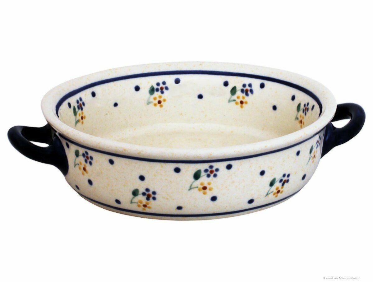 Diese charmante kleine Auflaufform ist die perfekte Wahl für Liebhaber handgefertigter Keramik und ideal für die Zubereitung kleiner, individueller Portionen. Gefertigt aus hochwertiger Bunzlauer Keramik, besticht sie nicht nur durch ihre außergewöhnliche Qualität, sondern auch durch ihre liebevoll von Hand aufgetragenen Verzierungen, die jede Form zu einem einzigartigen Kunstwerk machen. Ob für einen schnellen Snack, eine leichte Mahlzeit oder zum stilvollen Servieren kleiner Speisen – diese vielseitige Keramikform ist ein unverzichtbares Küchenutensil, das Funktionalität mit traditioneller Handwerkskunst vereint. Dank ihrer robusten Beschaffenheit ist sie sowohl für den Backofen als auch für die Mikrowelle geeignet und lässt sich mühelos in der Spülmaschine reinigen.