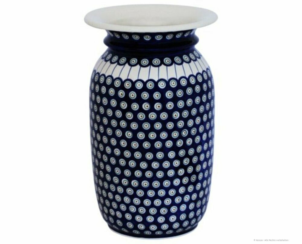 Das traditionelle Bunzlauer Dekor wird in sorgfältiger Handarbeit aufgetragen und unter einer schützenden Glasur versiegelt. So bleibt das Muster dauerhaft schön und widerstandsfähig. Die geschwungene Form mit dem breiten Rand verleiht der Vase eine harmonische Optik, die sich mühelos in verschiedene Wohnstile einfügt.