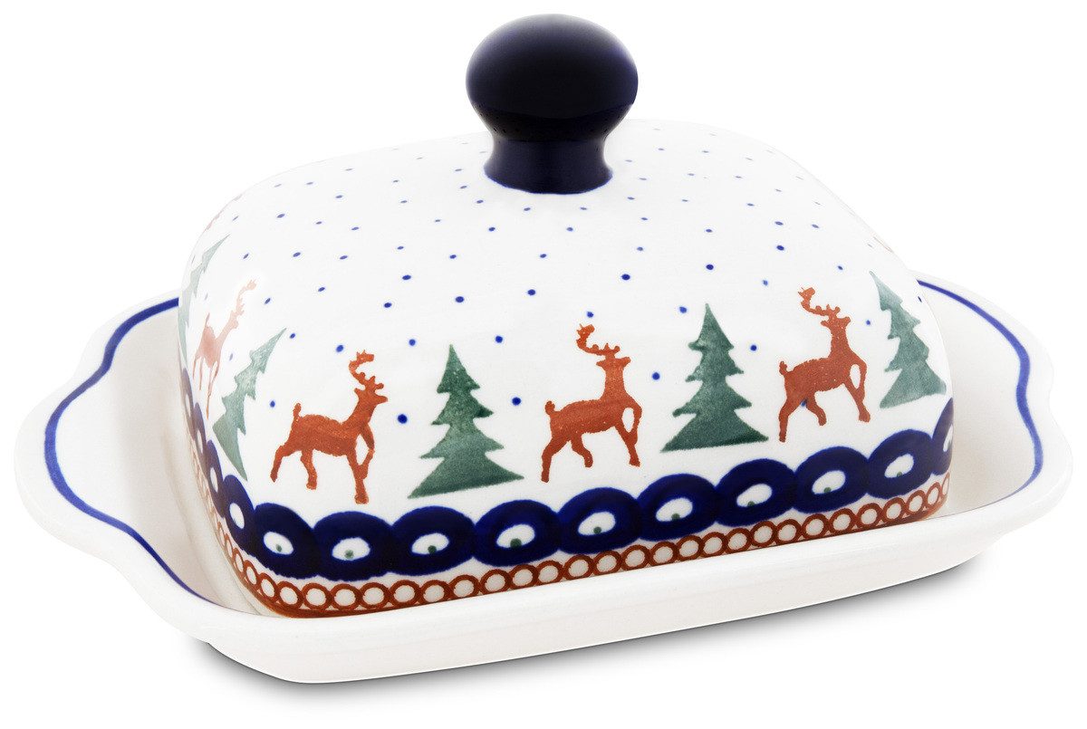 Diese wunderschöne Butterdose bringt winterliche Magie direkt auf Ihren Tisch. Mit ihrem detailverliebten Design aus Hirschen und Tannenbäumen, umrahmt von einer stilvollen blauen Bordüre, wird sie zum Blickfang in der kalten Jahreszeit. Die harmonischen Farben und das charmante Motiv sind ideal für die Weihnachtszeit und gemütliche Wintertage.