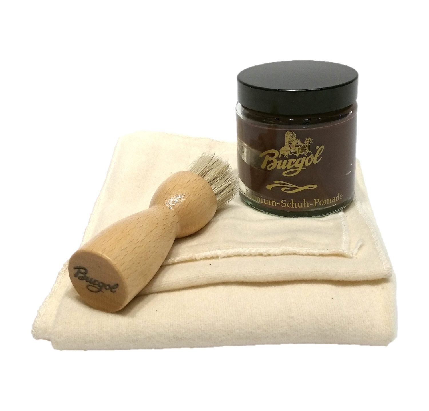 Burgol-Schuhpflegeset mit Premium-Schuhpomade "MITTELBRAUN", Tiegelauftragsbürste mit echtem Rosshaar zum Auftragen der Schuhcreme und Baumwolltuch - die Premiumschuhcreme aus der Burgol-Produktserie. Die Schuhpomade ist eine Mischemulsionscreme im ansprechendem Glastiegel und vervollständigt die professionelle Schuhpflege zusammen mit dem Burgol-Schuhwachs aus der klassischen Blechdose. Bestehend aus natürlichen Ölen und Wachsen, welche hervorragende Pflegeeigenschaften besitzen. Durch die natürlichen Farbpigmente erhalten Sie eine sichtbare Farbauffrischung und -aktivierung. Günstige Wasseremulsionscremes (Tubencremes) enthalten aus Kostengründen destilliertes Wasser und haben deshalb keine so positive Pflegeigenschaften. Natürlich pflegende Öle, Wachse und Farbpigmente pflegen und erhalten Ihre Schuhe nachhaltig! Anwendung findet die Schuh-Pomade als Tiefenpflege, da die Inhaltsstoffe tief in die Lederstruktur eindringen, sich an den Faser anheften und das Leder und die Struktur weich und geschmeidig macht. Außerdem wird die Haptik und Optik des Leders nachhaltig verbessert. Die Schuh-Pomade tragen Sie mit einer Tiegelbürste auf. Nach kurzer Einwirkzeit polieren Sie Ihre Schuhe mit einer Polierbürste aus. Все rahmengenähten und hochwertigen Glattlederschuhe pflegen Sie zusätzlich und regelmäßig mit dem Burgol-Schuhwachs. Das Schuhwachs versiegelt, schütz und imprägniert zusätzlich die Lederoberfläche. Außerdem erhalten Sie den gewünschten Hochglanz. Für feines, empfindliches und offenporiges Leder (helle Damenschuhe) empfehlen wir ausschließlich die Pflege mit der Burgol-Schuh-Pomade. Testen Sie hierfür immer an einer nicht sichtbaren Stelle (Zunge, Innenseite des Schuhs). Die Schuh-Pomade erhalten Sie in den Farben: Neutral, Schwarz, Bordeaux, Hellbraun, Mittelbraun, Braun, Grün, Rot, Grau, Blau und Dunkelbraun.